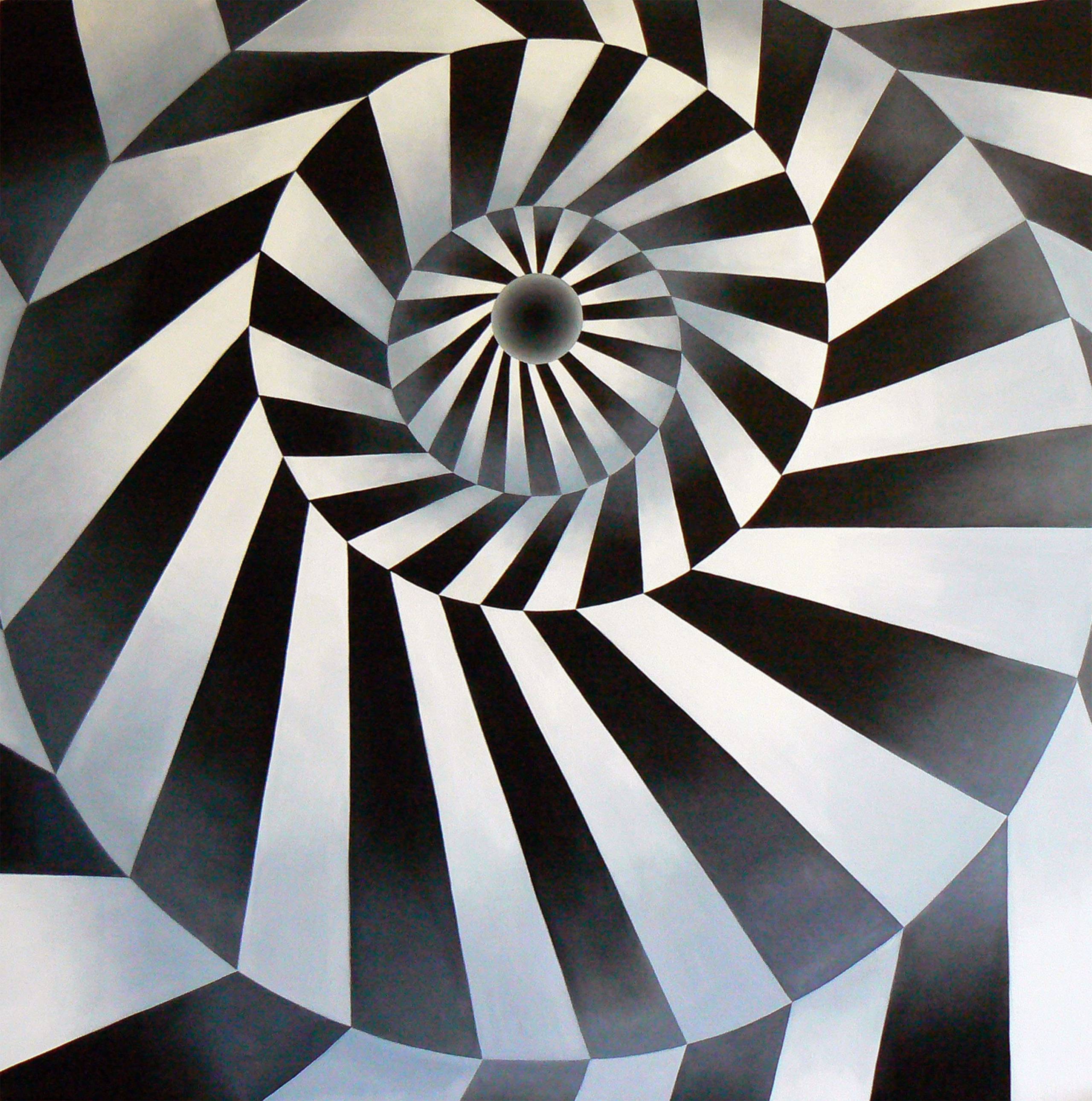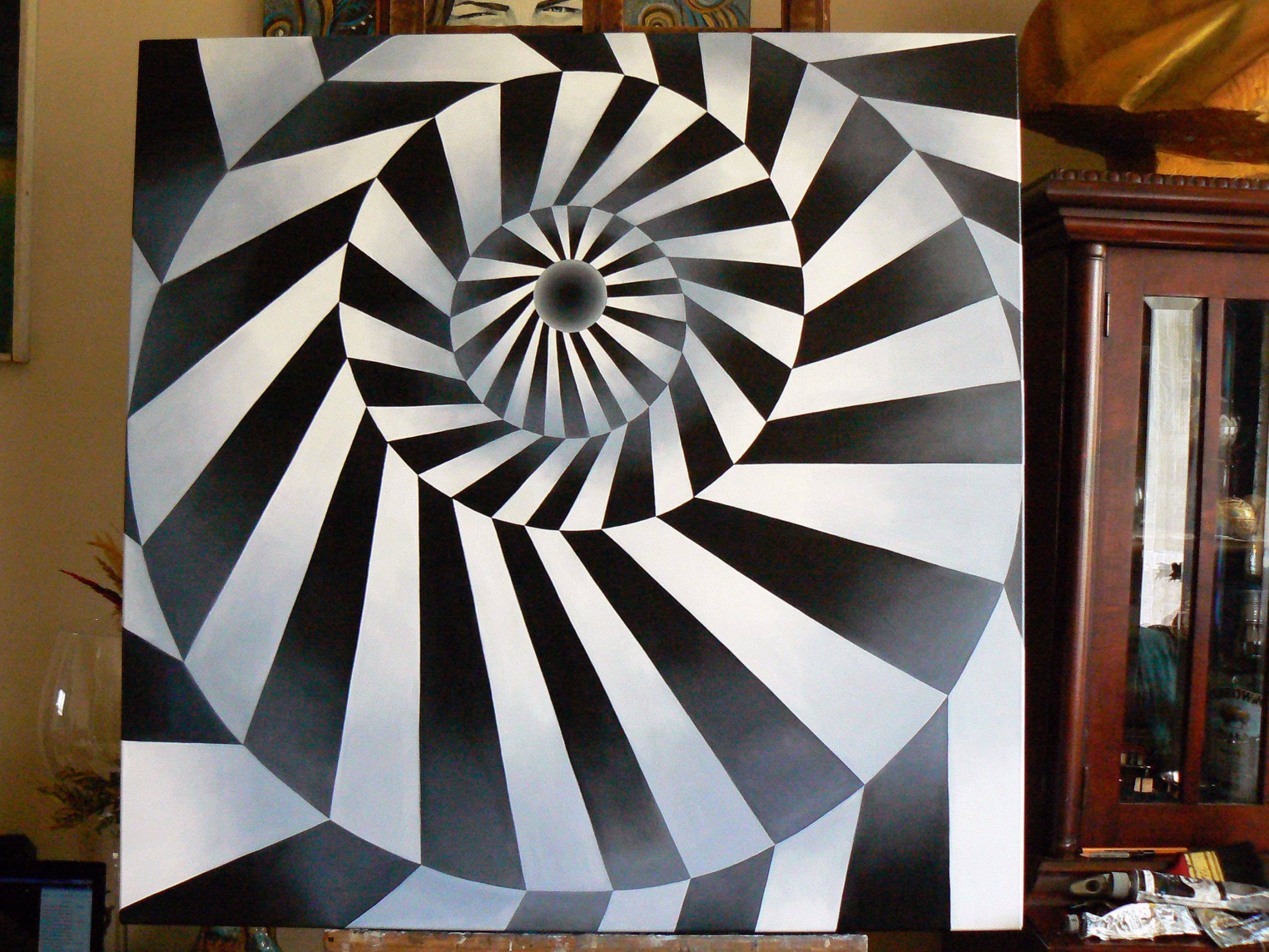 Na obrazie widzimy hipnotyzującą spiralę, której czarno-białe pasy wirują w nieskończoność. Geometryczna kompozycja przywodzi na myśl nieskończony tunel, wciągający nas w swoją głębię. Pasma kontrastujących kolorów wiją się, tworząc efekt iluzji optycznej. To, co na pierwszy rzut oka może się wydawać prostą grą barw i kształtów, jest w rzeczywistości staranną kompozycją oddającą dynamikę i ruch. Atmosfera obrazu jest zarówno zagadkowa, jak i hipnotyzująca. Można się poczuć trochę jak Alicja w Krainie Czarów, zderzając się z tym wizualnym "wow". Artysta wykorzystuje techniki iluzji, by wciągnąć widza w swoje dzieło i zmusić do zastanowienia nad istotą percepcji. Odbiorcy mogą odczuwać mieszankę zaskoczenia, zaintrygowania, a nawet odrobiny zawrotu głowy. Obraz. Ludzie mogą się zastanawiać, jak coś tak prostego może być tak skomplikowane. Trochę jak w życiu. Dla 7-letniego dziecka mogłoby to wyglądać jak magiczna dziura prowadząca do innego świata! Fascynacja i niepewność mieszają się, tworząc unikalne doświadczenie wizualne.