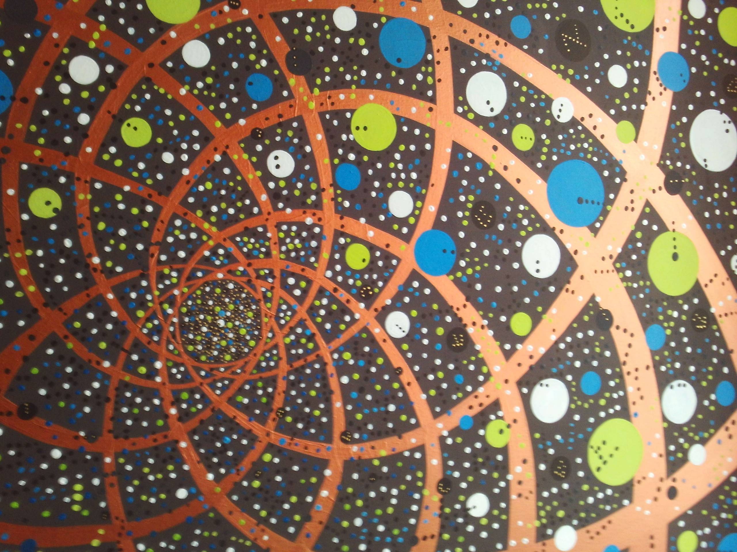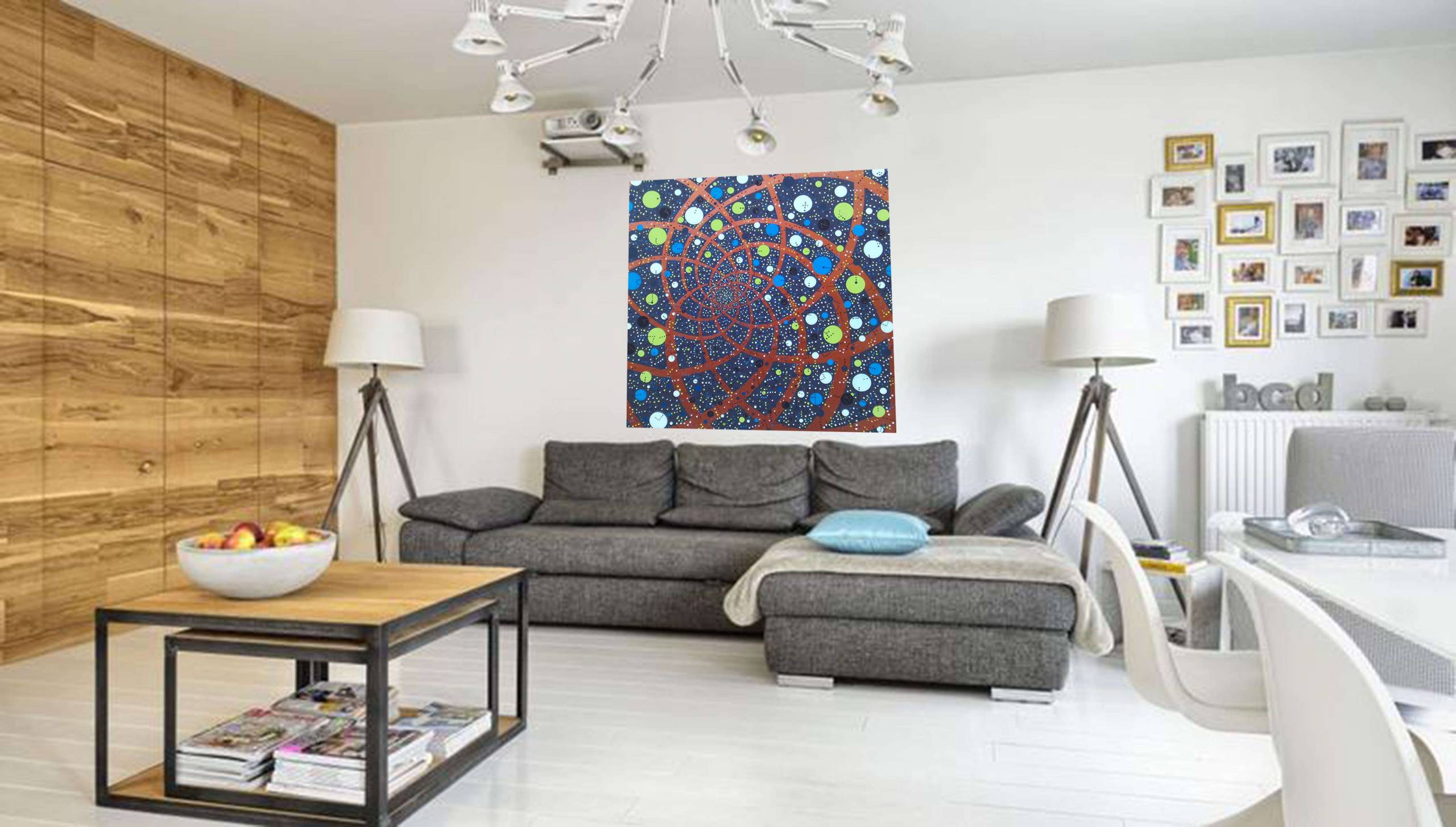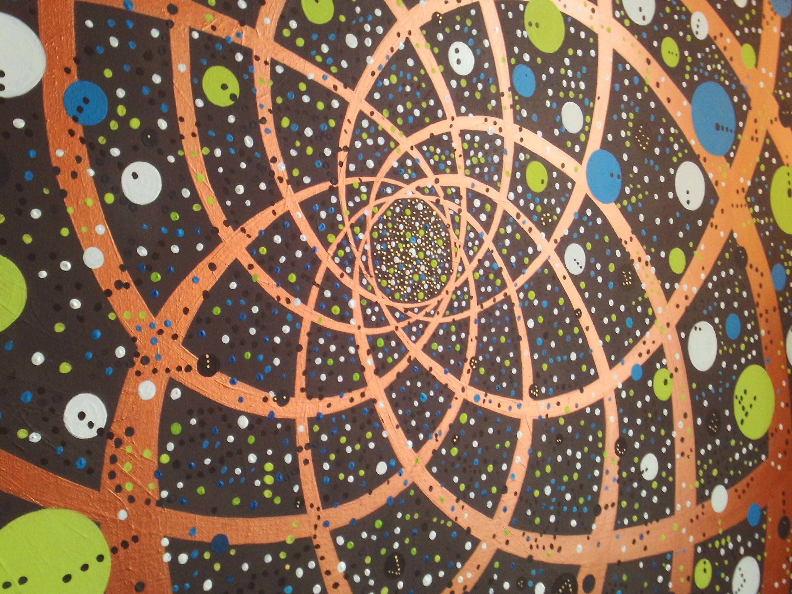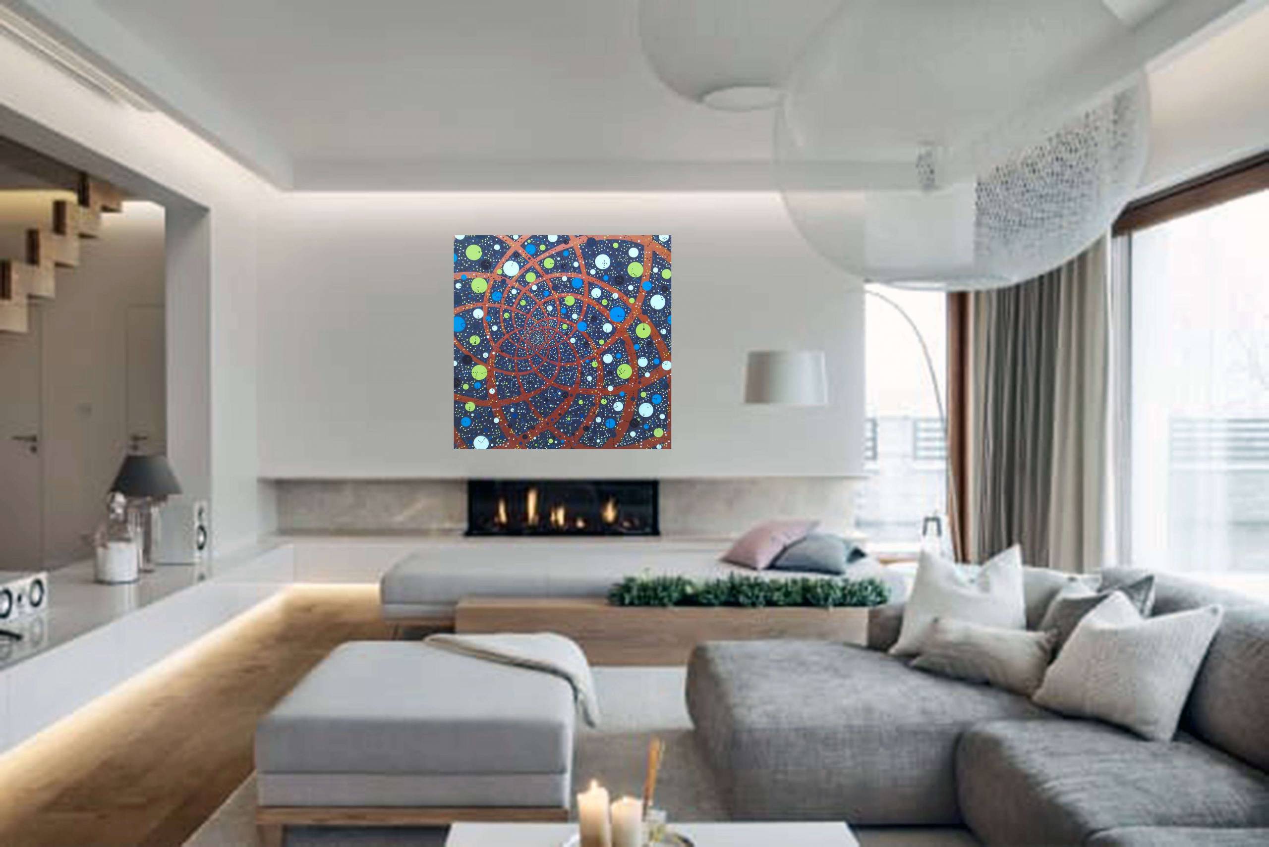 Obraz "Constellatio", wymiary: 100x100 cm. Wykonany w technice akrylu na płótnie. Przedstawia geometryczną konstelację składającą się z kulistych obiektów o różnych rozmiarach. Inspiracją do powstania pracy było sierpniowe nocne niebo, kiedy gwiazdy świecą najjaśniej. Konstelacja symbolizuje osobisty zbiór wspomnień, snów i ludzi, których spotkałem na swojej drodze./The painting "Constellatio", dimensions: 100x100 cm. Made in the technique of acrylic on canvas. It shows a geometric constellation consisting of spherical objects of various sizes. The work was inspired by the August night sky, when the stars are shining brightest The constellation symbolizes a personal collection of memories, dreams and people whom I met on my way.