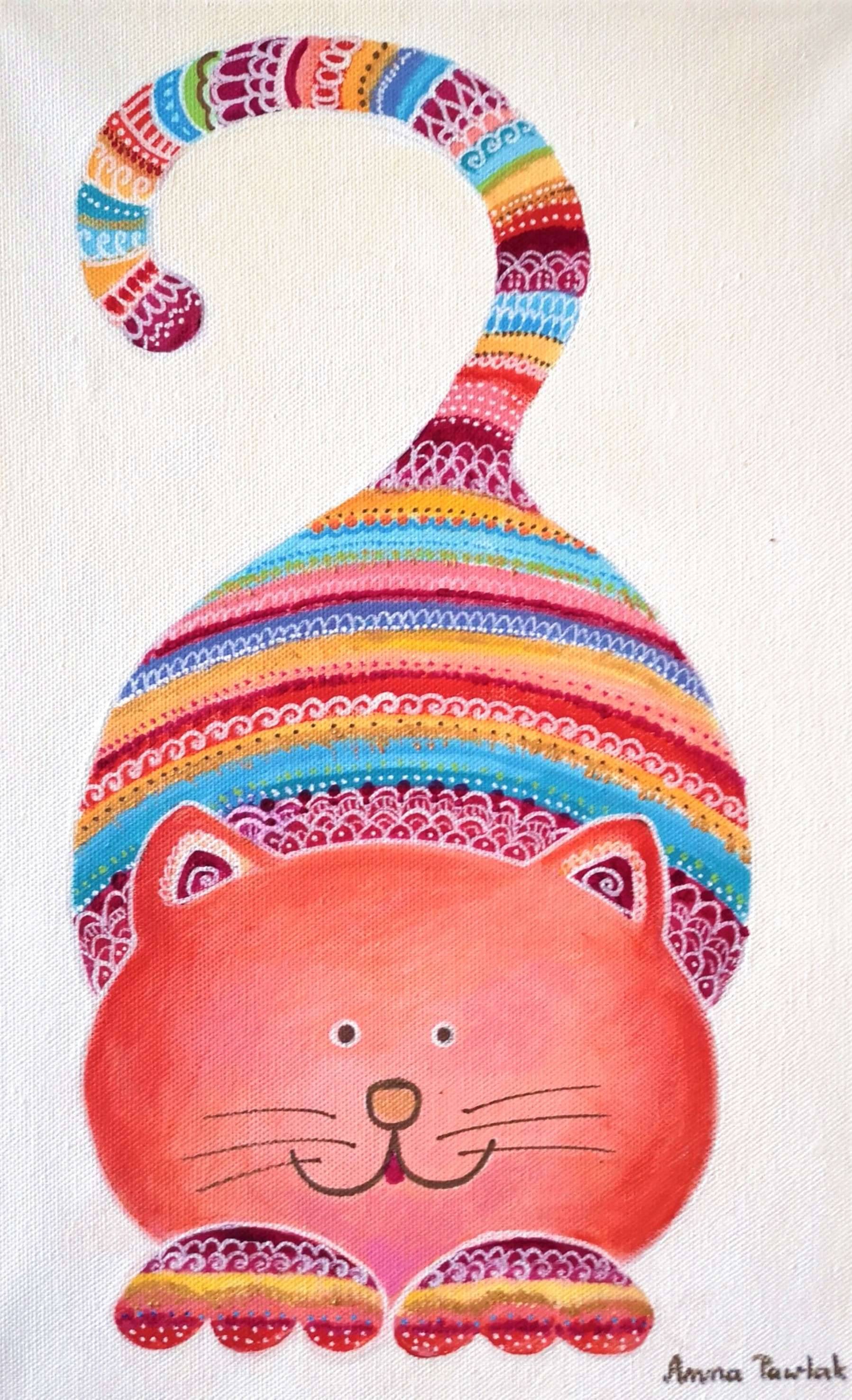 Obraz kolorowy, radosny ,pełen pozytywnej harmonii, doskonały do dziecięcego pokoju. Namalowany wypracowaną, własną techniką. Tło zamalowane na ciepły odcień bieli. Na obrazku występują złocenia. Wspaniały prezent dla dziecka kochającego zwierzęta.