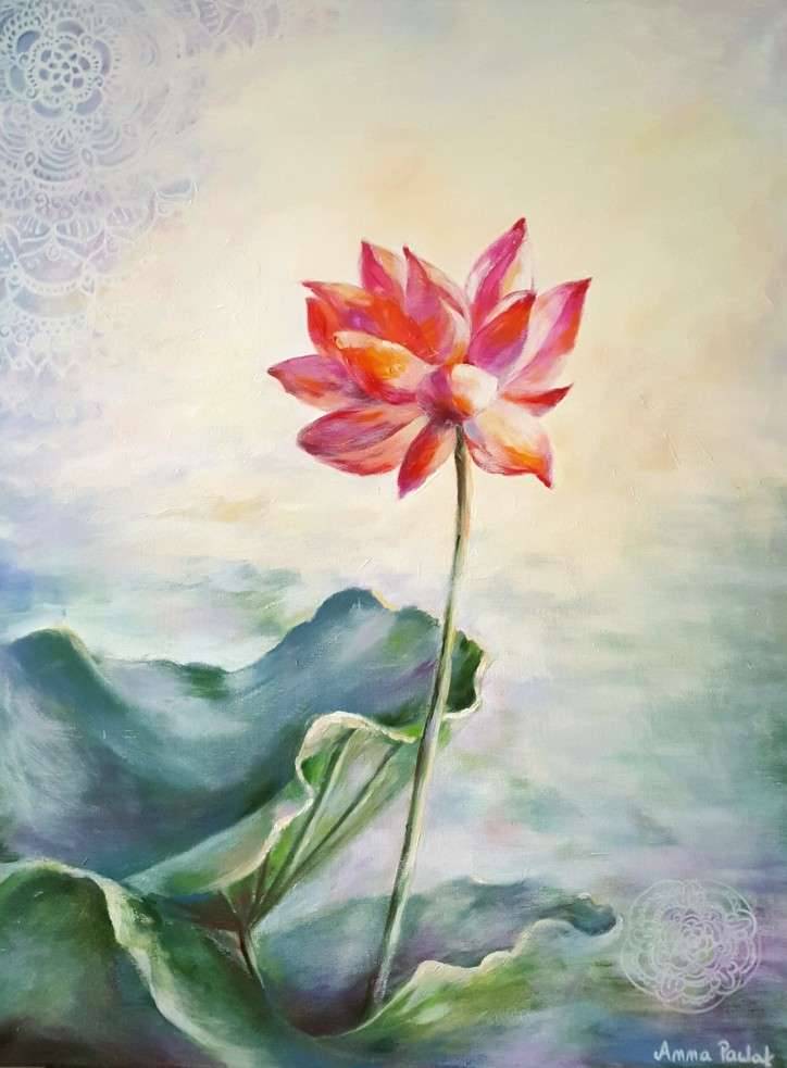 "Kwiat lotosu" to obraz pełen harmonii i spokoju. Z delikatnej mgiełki wyłaniają się dwie mandale nadając pracy oryginalny charakter. Lotos to wyjątkowy kwiat ,wyrasta bowiem z błota a mimo to, jego płatki zawsze są nieskazitelnie czyste. W tradycji Wschodu kwiat lotosu symbolizuje przebudzony umysł. Jest również oznaką czystości, niewinności, i doskonałości. Obraz jest energetyczny. Doskonały dla tych, którzy kochają naturę, minimalizm i jogę .Wspaniale sprawdzi się w pomieszczeniach lub kącikach wypoczynku, relaksu, masażu .Obraz był prezentowany w studio MY Yoga w Warszawie w 2020 r.. Zabezpieczony matowym werniksem akrylowym, nie wymaga ramy- boki są zamalowane i tworzą kontynuację obrazu. Sygnowany.