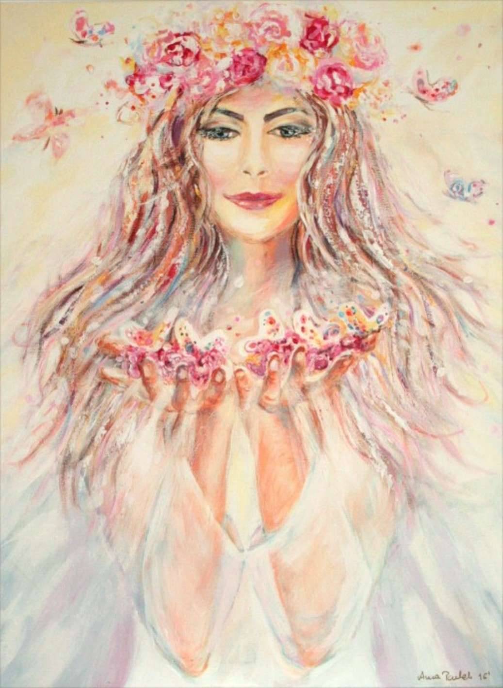 Obraz energetyczny, pełen spokoju , harmonii i światła. Pastelowe, delikatne barwy podkreślają świetlistość i ulotność Anielskiej istoty.