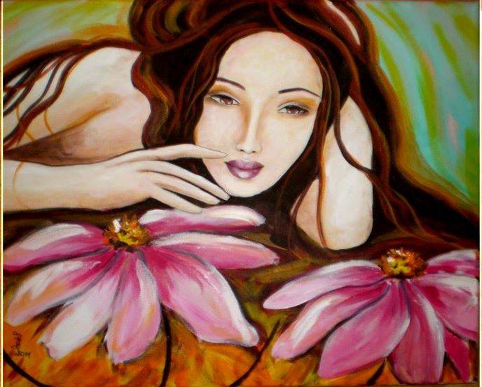 Na obrazie widzimy postać kobiecą o delikatnych rysach twarzy, która zdaje się unosić wśród falujących linii włosów i kwiatów. Dominujące kolory to ciepłe brązy, zmysłowe róże i stonowane zielenie, które współgrają w harmonijny sposób. Kształty mają peewnę łagodność, a kompozycja jest dobrze zbalansowana, co dodaje dziełu pewnej spokojoe równowagi. Atmosfera obrazu jest zmysłowa, może nawet nieco senna, jakby czas zatrzymał się na chwilę. Styl artysty przypomina nieco secesję, z jej organicznymi formami i wyrazistością linii. Technika malarska jest finezyjna, z subtelnymi przejściami kolorów. Obraz budzi w widzu uczucie nostalgii i pragnienie zatracenia się w marzeniach. Oh, wow, powiedziałby ktoś, zachwycony pięknem tej wizji. Dzieciak mógłby wprost powiedzieć: "Pani śpi na kwiatuszkach". Przyglądając się temu dziełu, można odczuwać swoiste "dreamy" wibracje, które przenoszą nas w świat wyobraźni, pełen delikatnych emocji i refleksji nad pięknem natury i człowieczeństwa.
