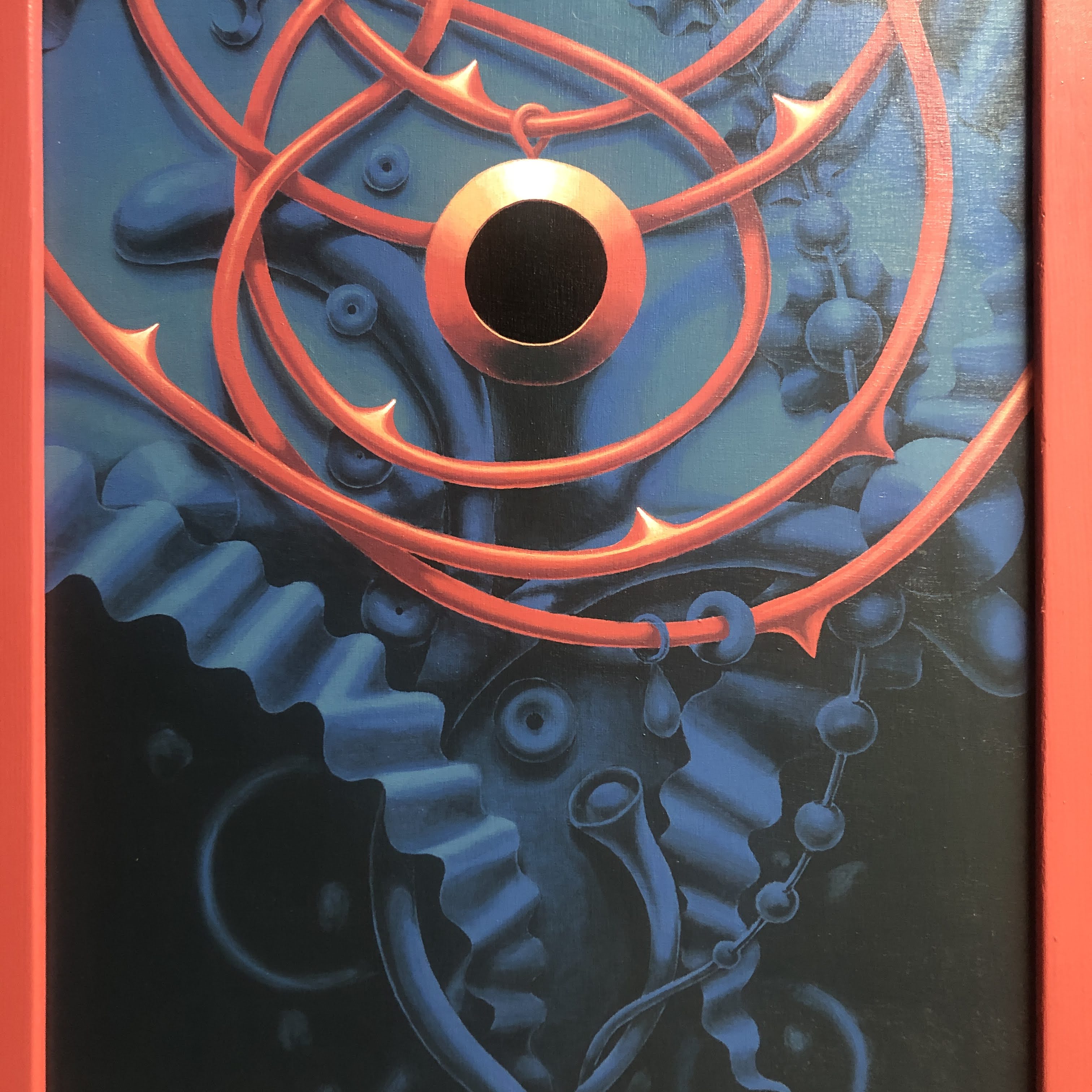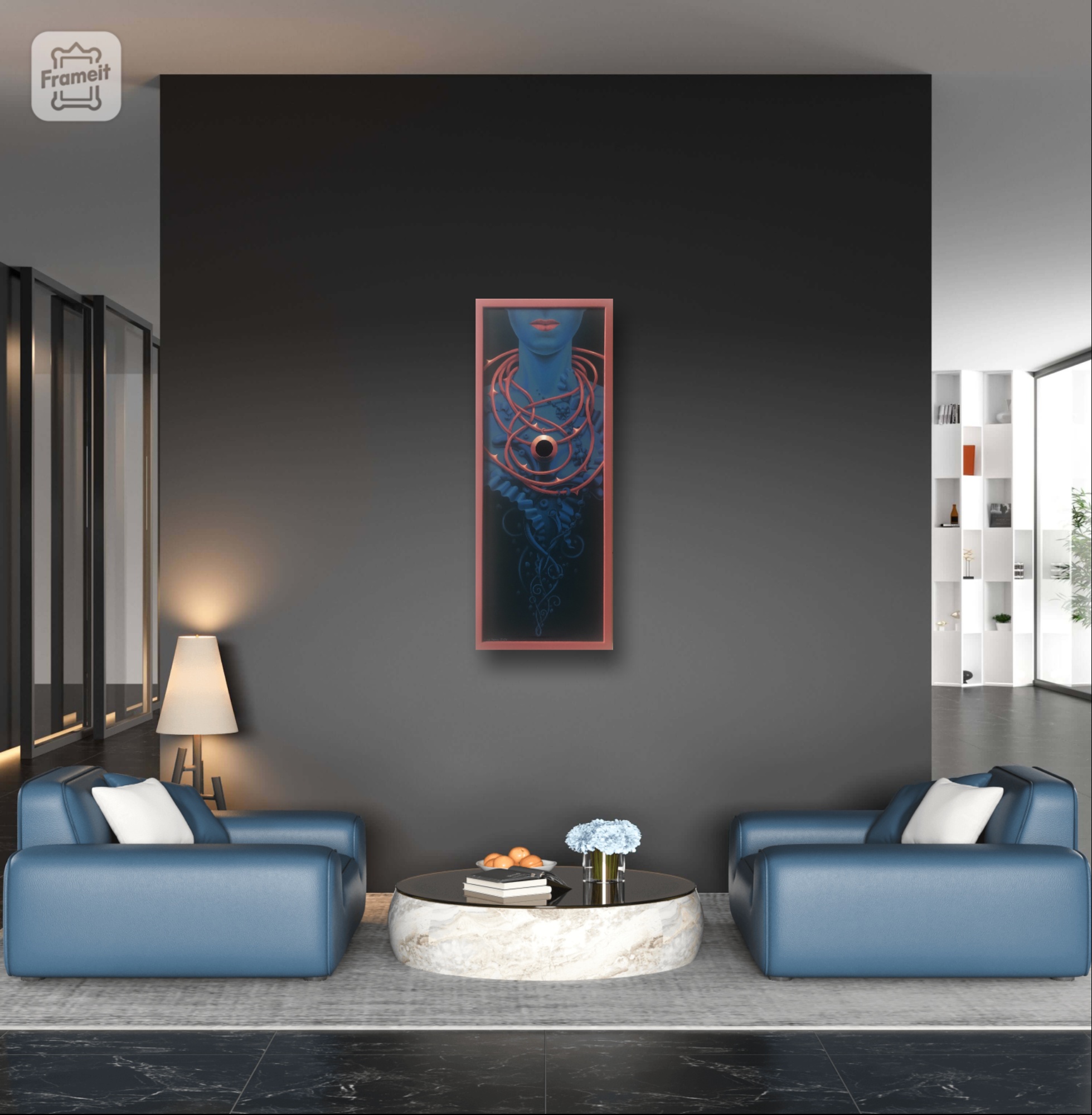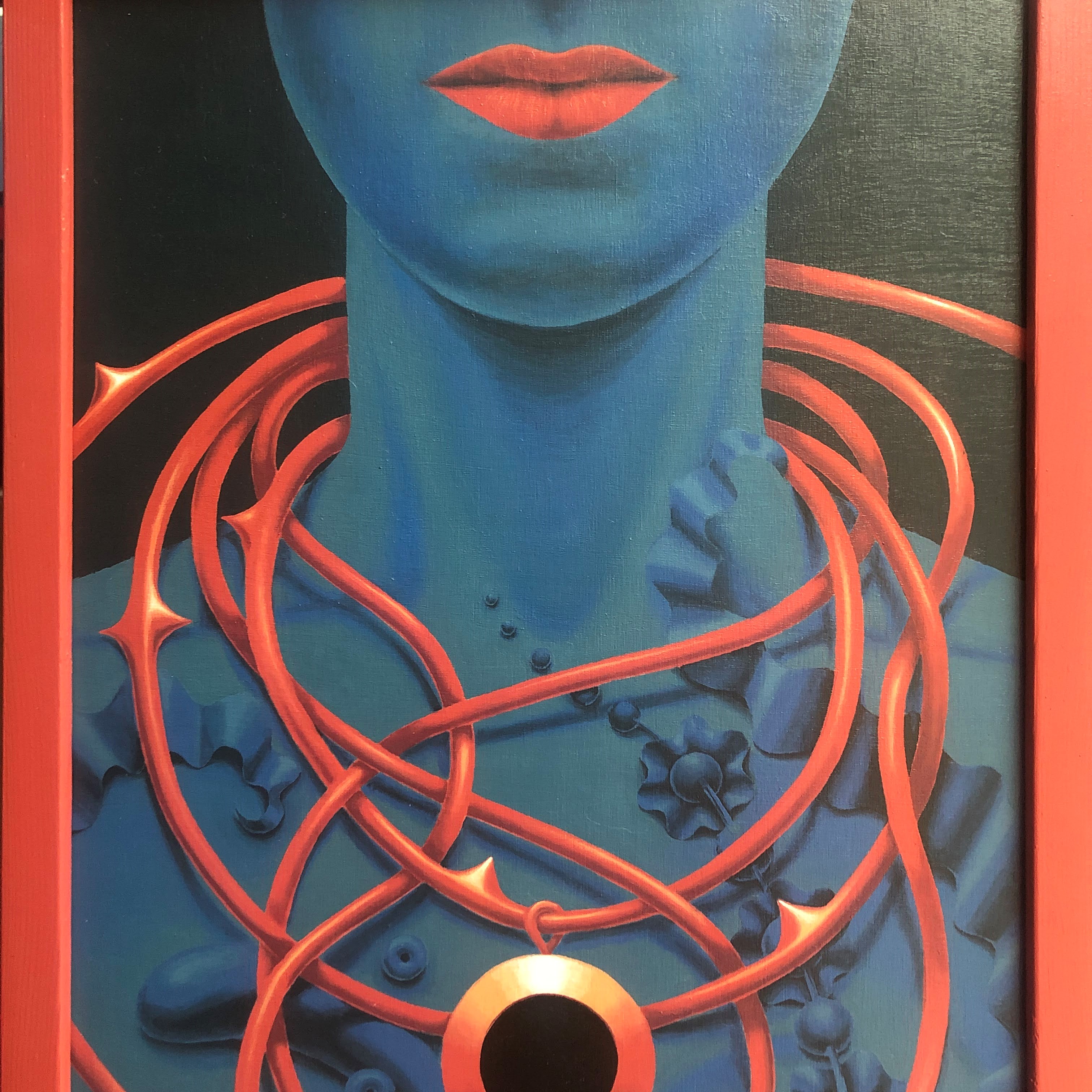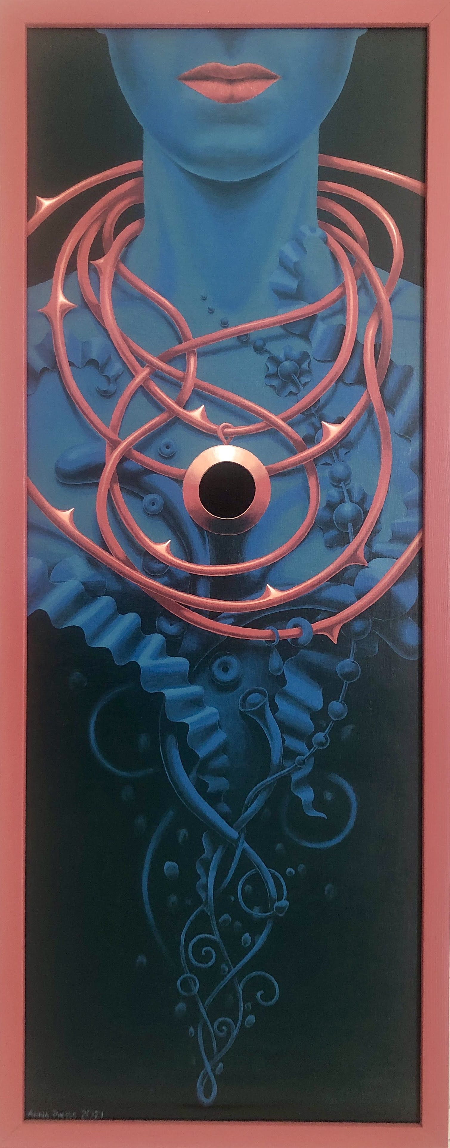Naszyjnik Obraz akrylowy na drewnie 80x30cm (wysoki i wąski). Oprawiony w drewnianą ramę w kolorze dopasowanym do jego zawartości. Przedstawia postać kobiety, na której dekolcie wije się czerwony naszyjnik z wisiorkiem z czarnym oczkiem. Sznury naszyjnika są usiane cierniami. Postać kobiety wyłania się z jednego punktu w dolnej części obrazu - powstaje z wielu przenikających się elementów. Czym wyżej, tym elementów jest więcej i są bardziej wyraziste. Tło jest bardzo ciemne, prawie czarne. Sygnatura znajduje się na froncie. Dostępny jest certyfikat autentyczności.