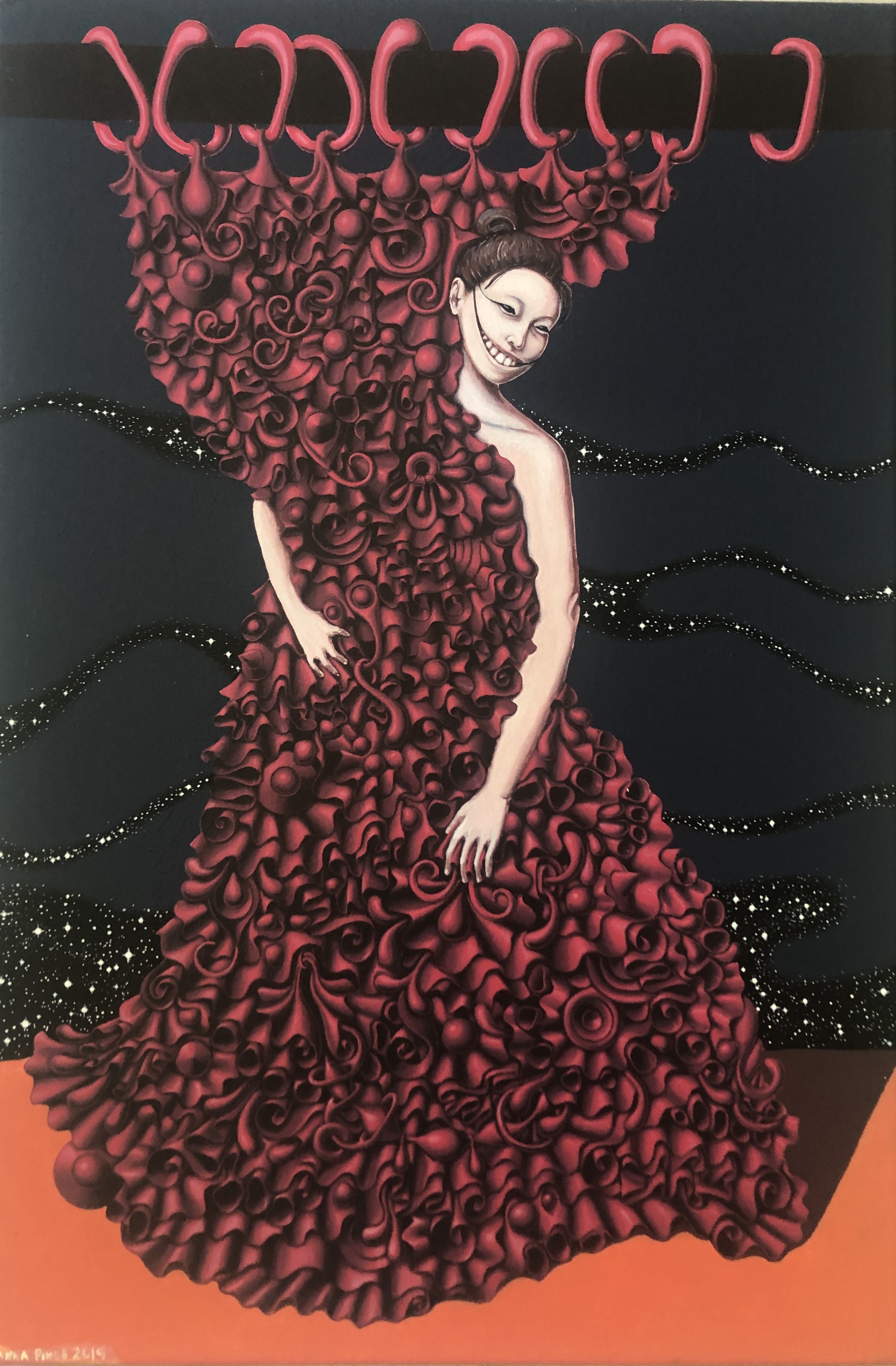 Za kurtyną Akryle na płótnie 60x40cm Obraz przedstawia surrealistyczną postać - nagą kobietę - która wychyla się zza czerwonej teatralnej kurtyny. Jej twarz jest mroczna - uśmiechnięte usta ciągną się aż to linii włosów. Kurtyna, za którą się ukrywa, jest skonstruowana z drobnych abstrakcyjnych nieregularnych kształtów. To struktura składająca się z falban, krążków, kul, wstążek, spirali i wielu innych. W tle na małych falujących fragmentach widzimy rozgwieżdżone niebo.