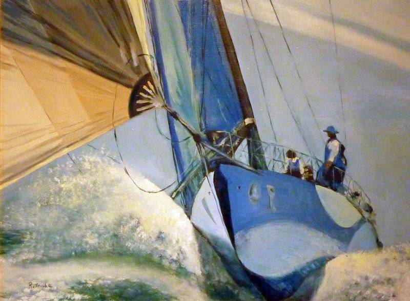 Obraz przedstawia dynamiczną scenę regatową, pełen ruchu i życia. Dominują na nim odcienie błękitu i bieli, a potężna łódź żaglowca przecina fale niczym nóż przez miękkie masło. Kaptury żagli unoszą się w rytmie morskiego wiatru, który jakby chciał opowiedzieć nam sekret oceanu. Na pokładzie widać grupę osób zajętych żeglowaniem, a ich sylwetki dodają scenie autentyczności i napięcia. Atmosfera obrazu przesycona jest poczuciem wolności i nieustannej przygody. Jest to moment uchwycony w czasie, gdzie wszystko wydaje się być w ruchu - fale rozpryskujące się wokół kadłuba i lekki poślizg łodzi na powierzchni wody to prawdziwa magia natury. Wydaje się, że artysta zastosował techniki impresjonistyczne, skupił się na oddaniu emocji i dynamiki sceny zamiast szczegółowej dokładności. Strzały kolorów, jakby pędzel tańczył po płótnie, dodają obrazowi energii. Patrząc na obraz, można poczuć smak morskiej soli na ustach i wiatr we włosach. Wyobraźnia podpowiada różne interpretacje - dla niektórych to symbol wolności, dla innych metafora życiowych zmagań. Ja myślę sobie, że to fajna zabawa! W sercu można usłyszeć echo okrzyków, initial rush pędzącej łodzi. Kiedy spojrzysz na dzieło, czujesz, że znajdujesz się na pokładzie, uczestniczysz w tej ekspedycji. Co za emocja!