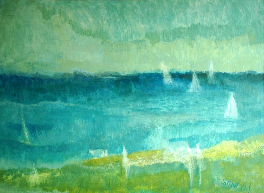 Na obrazie dominuje spokojna paleta zieleni i błękitów, które płynnie przeplatają się w formie miękkich, rozmytych pociągnięć pędzla. Delikatne kształty żaglówek wydają się dryfować po spokojnej tafli wody, którą przecinają subtelne refleksy światła. Dzieło emanuje atmosferą spokoju i kontemplacji, przypominając letni dzień nad jeziorem. Stonowane odcienie tworzą uczucie melancholii, ale i ulgi. Wydaje się, że artysta zastosował technikę impresji, aby uchwycić chwilowy nastrój natury. Obraz wywołuje wrażenie bezczasowego zatrzymania. Dziecko mogłoby powiedzieć: "Wygląda jak wakacje z żaglówkami!". Te intensywne kolory powodują, że zaczynamy marzyć, a czas zwalnia biegu. Ta praca może skłonić widza do zatrzymania się na chwilę, by odnaleźć swoje miejsce w chaosie dnia codziennego. Styl obrazu jest subtelnie przypominający breather; jak moment na oddech. Widz podejmuje własną interpretację, błądząc wśród kolorów i kształtów. Ta abstrakcyjna wizja rzeczywistości skłania do refleksji nad naszą przeszłością i przyszłością. Harmonijne połączenie form, barw, a także emocje, które wyzwala, sprawiają, że ten obraz to prawdziwe dzieło sztuki.
