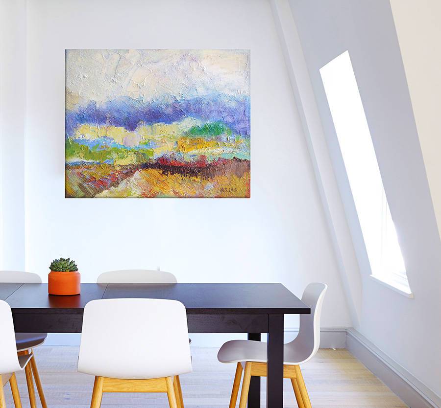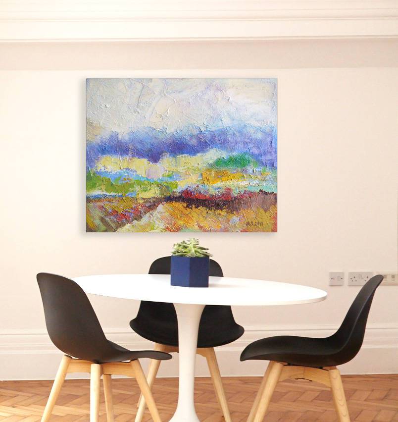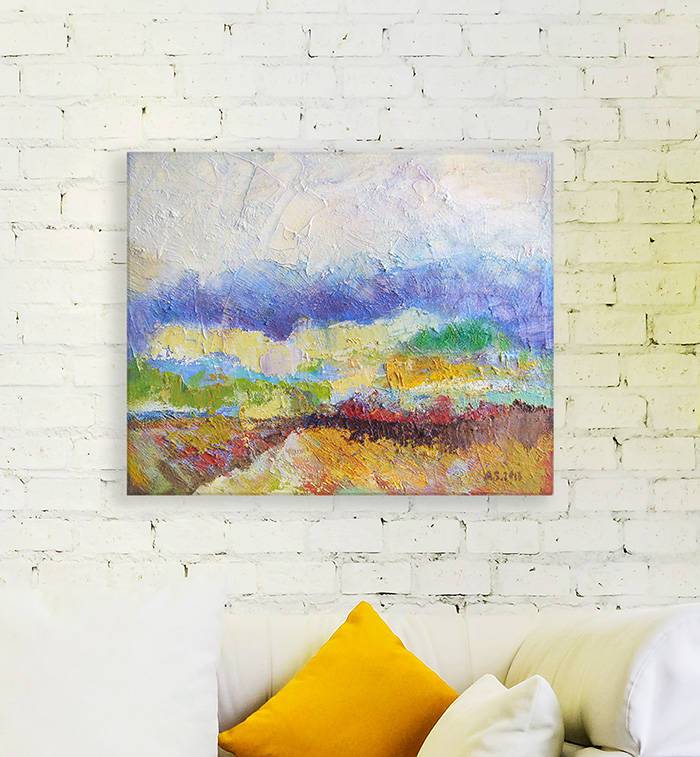 Obraz olejny na płótnie lnianym. Bogata kolorystyka oraz gruba faktura farby. Oryginał, unikat, datowany, sygnowany (na odwrocie). Obraz (blejtram) bez ramy - wymaga oprawy. Format 40 cm x 50 cm, Nowoczesny pejzaż do dekoracji domu - do salonu, do pokoju, do sypialni. Grafika chroniona prawem autorskim, wszelkie prawa zastrzeżone. Rzeczywiste kolory mogą się nieznacznie róznić w zależności od rodzaju monitora.