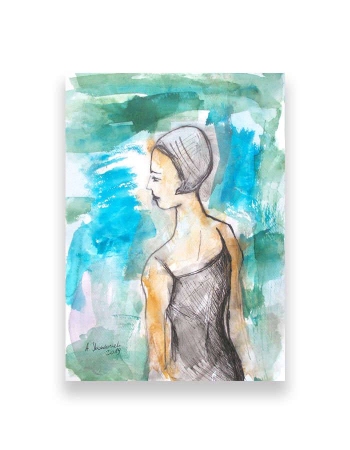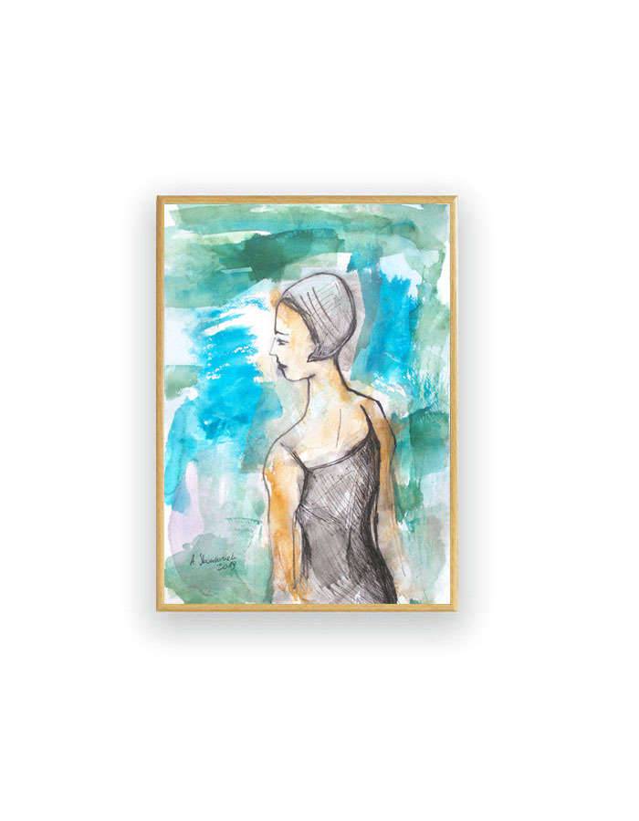Pływaczka - stylizowany szkic. Grafika sygnowana, unikat, oryginał, karton akwarelowy. Praca w ramce oraz pod szkłem - 22,5 cm x 31 cm. Wszelkie prawa zastrzeżone.