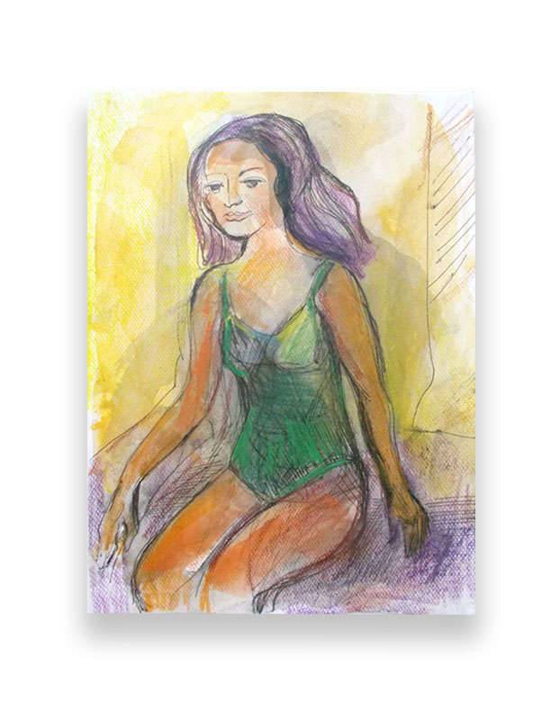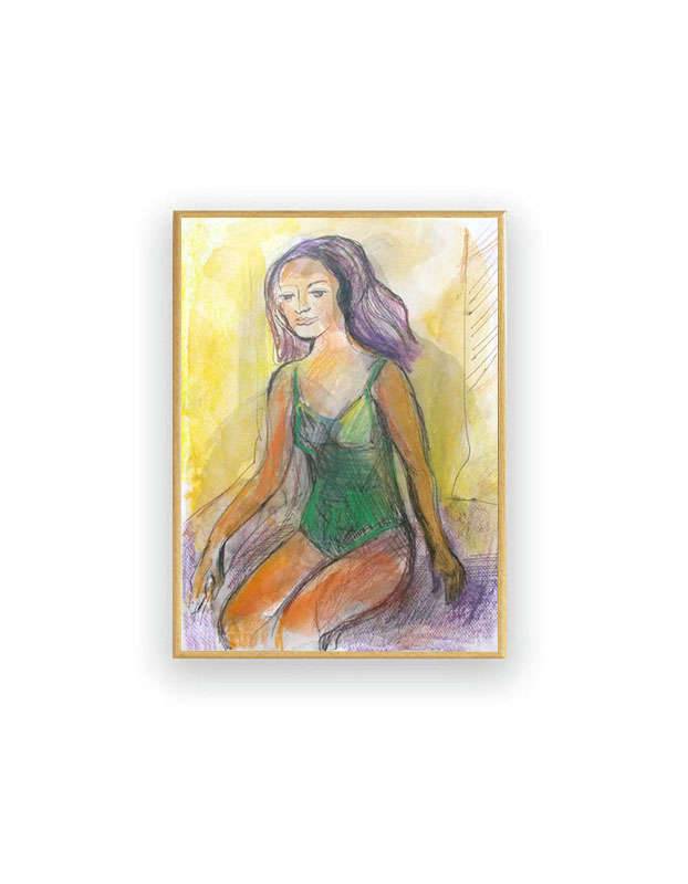 Ekspresyjny szkic z dziewczyną na plaży. Grafika sygnowana, unikat, oryginał, karton akwarelowy. Praca w ramce oraz pod szkłem - 22,5 cm x 31 cm. Wszelkie prawa zastrzeżone.