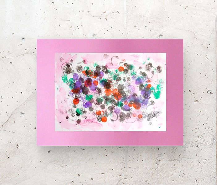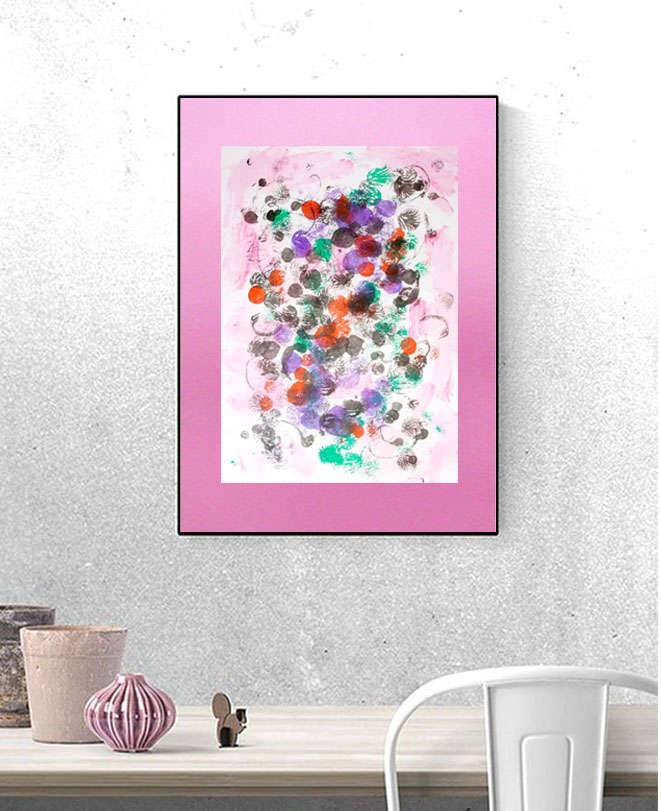 Abstrakcyjna, dynamiczna kompozycja. Oryginalna grafika ręcznie wykonana. Praca na grubym papierze naklejona na różowe tło 30x40 cm, oznakowana inicjałami A.S. Obrazek można dowolnie zawiesić - w pionie lub poziomie. Pracę wystarczy samemu oprawić w antyramę lub fotoramę w podanym rozmiarze. Oryginalna dekoracja do nowoczesnych wnętrz. Wszelkie prawa zastrzeżone. Grafika sprzedawana jest bez oprawy, bez ramki.