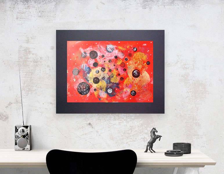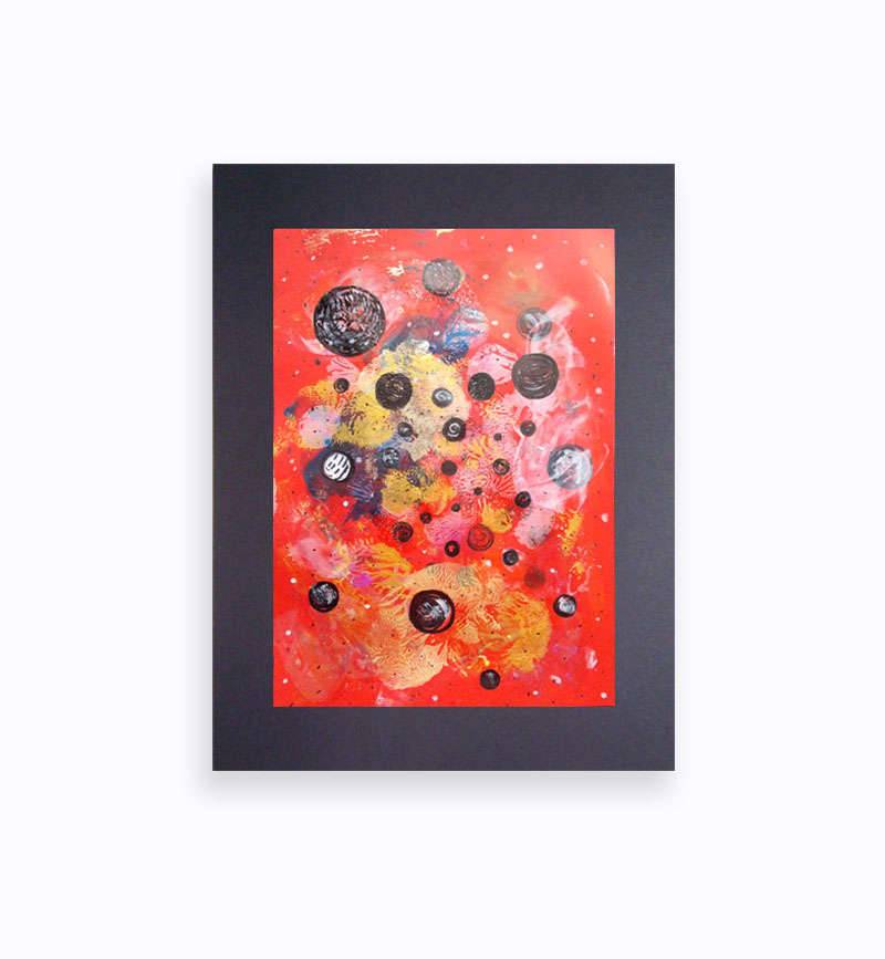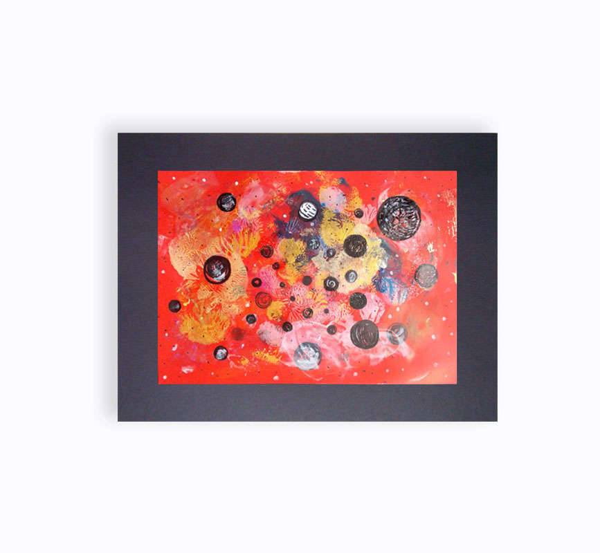 Abstrakcyjna, dynamiczna kompozycja. Kolorystyka: złoty, czarny, czerwony. Oryginalna grafika ręcznie wykonana. Praca na grubym papierze (270 gsm), naklejona na czarne tło 30x40 cm, oznakowana inicjałami A.S. Obrazek można dowolnie zawiesić - w pionie lub poziomie. Pracę wystarczy samemu oprawić w antyramę lub fotoramę w podanym rozmiarze. Oryginalna dekoracja do nowoczesnych wnętrz. Wszelkie prawa zastrzeżone. Grafika sprzedawana jest bez oprawy, bez ramki.