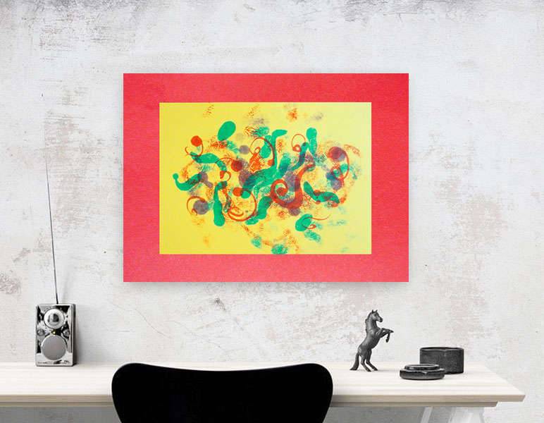 Abstrakcyjna, dynamiczna kompozycja. Oryginalna grafika ręcznie wykonana. Praca na grubym papierze naklejona na czerwone tło 30x40 cm, oznakowana inicjałami A.S. Obrazek można dowolnie zawiesić - w pionie lub poziomie. Pracę wystarczy samemu oprawić w antyramę lub fotoramę w podanym rozmiarze. Oryginalna dekoracja do nowoczesnych wnętrz. Wszelkie prawa zastrzeżone. Grafika sprzedawana jest bez oprawy, bez ramki.