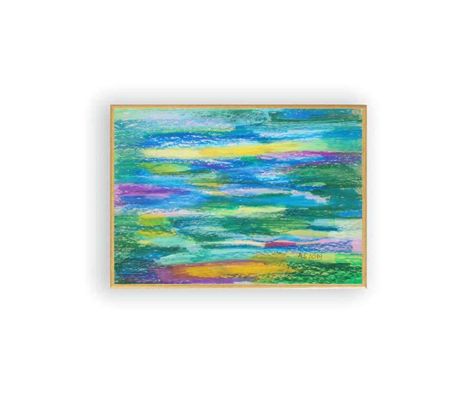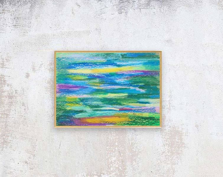 Abstrakcyjny szkic, impresja morza, wody. Kolorowy rysunek w technice pasteli olejnych na kartoniku. Praca jest oprawiona w ramce oraz pod szkłem - 22,5 cm x 31 cm. Wszelkie prawa zastrzeżone.
