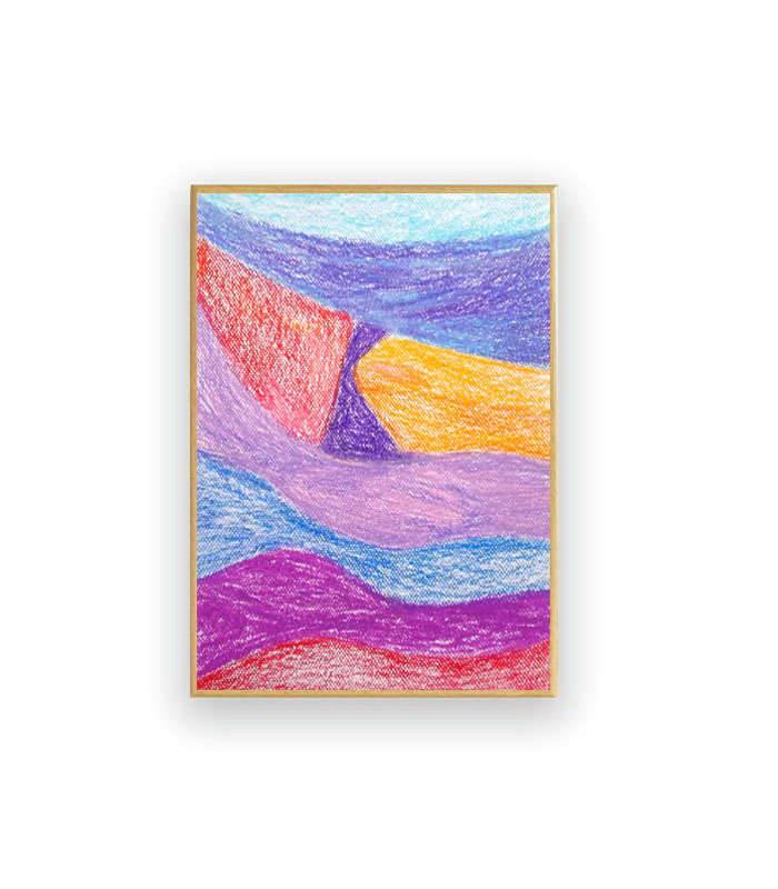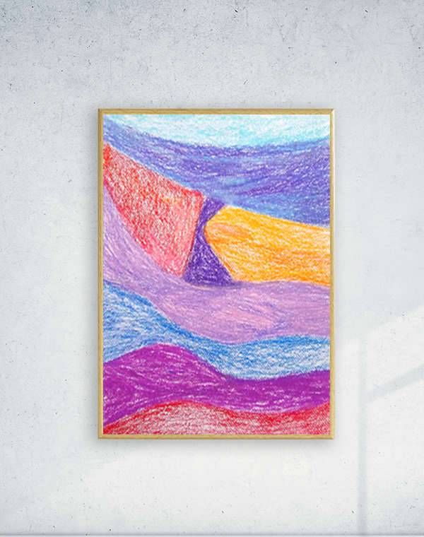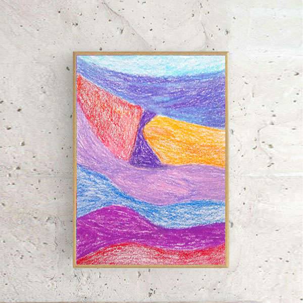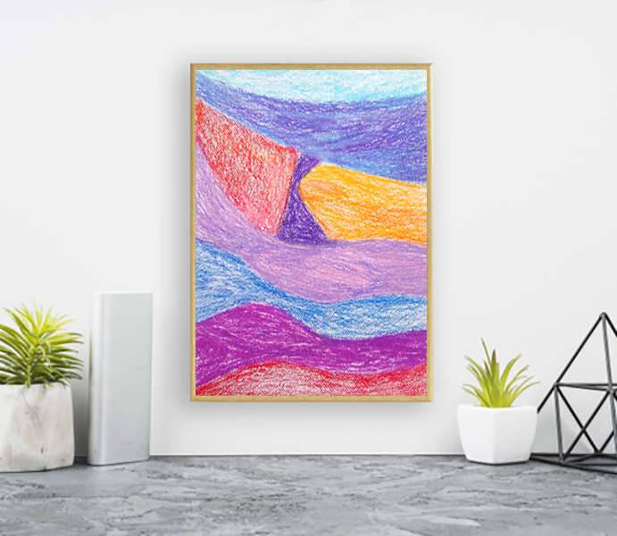 Abstrakcyjny szkic inspirowany pejzażem. Kolorowy, dekoracyjny rysunek w technice pasteli olejnych na kartoniku. Praca jest oprawiona w ramce oraz pod szkłem - 22,5 cm x 31 cm. Wszelkie prawa zastrzeżone.
