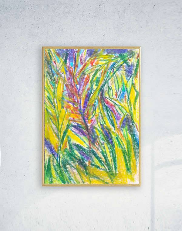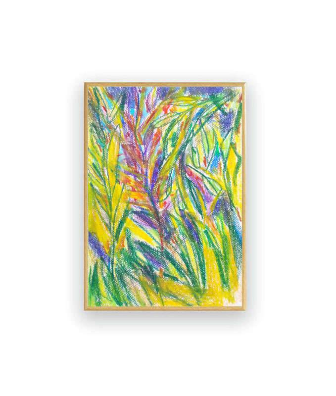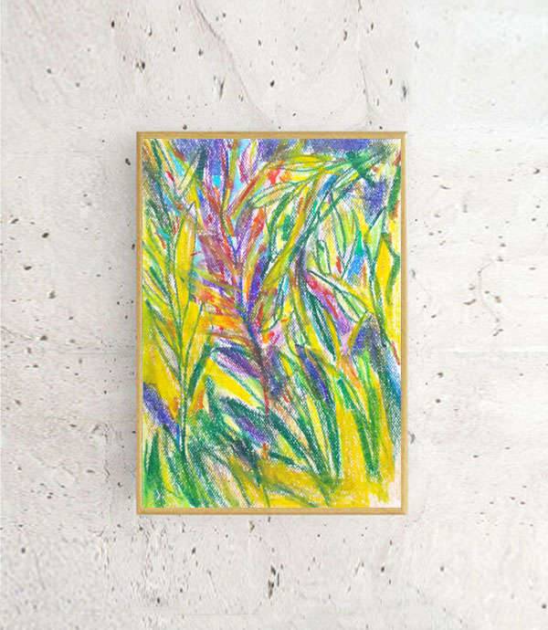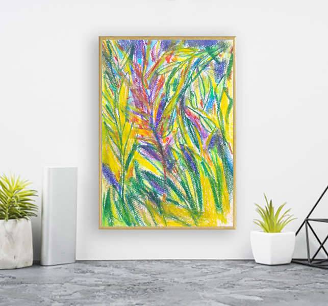 Dżungla- kolorowy szkic inspirowany przyrodą. Nowoczesny, dekoracyjny rysunek w technice pasteli olejnych na kartoniku. Praca jest oprawiona w ramce oraz pod szkłem - 22,5 cm x 31 cm. Wszelkie prawa zastrzeżone.