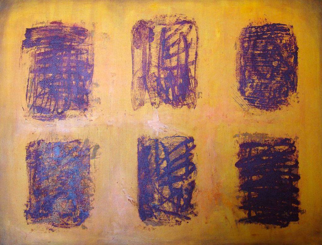 Na tym obrazie dominuje ciepły, złocisty kolor, który wypełnia tło. Na nim widnieją sześc prostokątów, które wyglądają jak abstrakcyjne, fioletowe szkice. Ich tekstura jest szorstka, jakby niedbała, ale przyciągają uwagę swoją intensywnością. Kompozycja jest regularna, symetrycznie rozmieszczona, co dodaje dziełu harmonię, mimo pewnego chaosu, który widać w samych kształtach. Atmosfera jest tajemnicza i nieco melancholijna. Kolory grają ze sobą, tworząc kontrasty, które przypominają mi jesienne liście spadające z drzew. Jest w tym coś magicznego, ale i spokojnego. Artysta zastosował technikę impasto, co przypomina mi o nieśmiałych próbach rysowania, jak małe dzieci tworzą swoje arcydzieła na pergaminie. Obraz może wywoływać różnorodne emocje; niektórzy zobaczą w nim spontaniczność, a inni głębsze uczucia, jak nostalgia za minionymi chwilami. Dla mnie to takie visual poetry, coś, co można interpretować na milion sposobów. Przywodzi na myśl wspomnienia z dzieciństwa, może to abstrakcyjne dźwięki ulubionej piosenki, której nie rozumiemy, ale czujemy. Jak patrze na to dzieło, myślę sobie o niepewności życia, gdzie coś pozornie chaotycznego może kryć w sobie piękno. Czuję, że artysta chciał pokazać, jak różnorodnie życie potrafi się układać, nawet w najbardziej nieoczekiwanych momentach. To takie jak rysowanie kredkami na stole, kiedy wszyscy chcą być poważni, ale tam jest taka wolność.