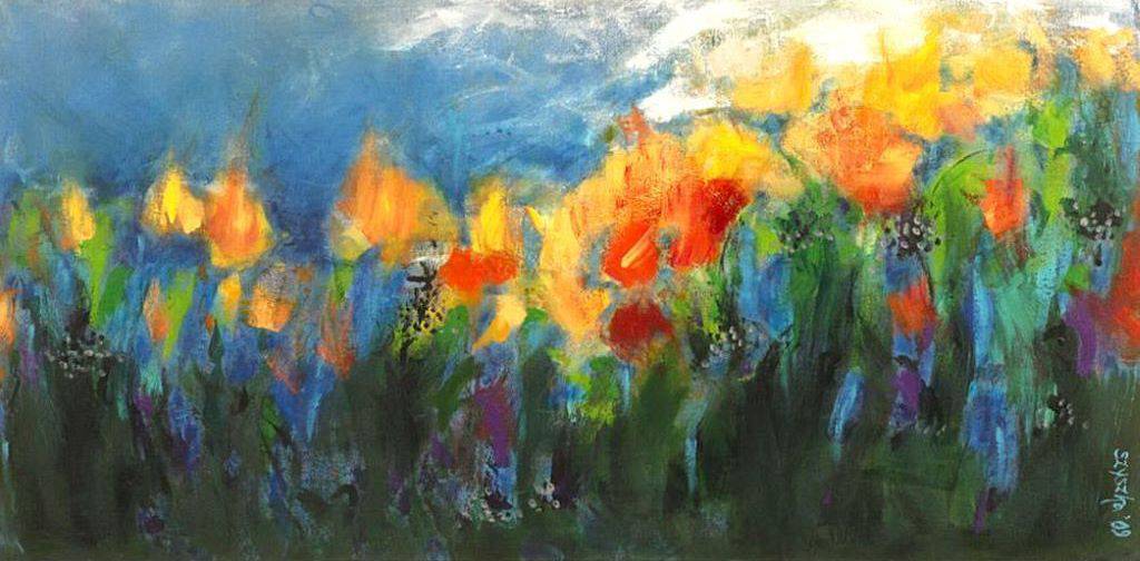 Obraz przedstawia eksplozję kolorów, które tańczą na płótnie niczym ogniste płatki kwiatów. Dominują intensywne pomarańcze, czerwienie i złamane zielenie, tworząc żywe kontrasty z ciemnym, niemal gęstym tłem. Fiery kwiaty wydają się płonąć na wietrze, tworząc dynamiczną linię horyzontu. Niby wiatr rozwiewa chmury, niebo przechodzi z jasnego, niemal białego, w głęboki błękit, dodając obrazowi błogości i głębi. Atmosfera dzieła jest pełna energii, jakby artysta uchwycił moment wiosennego przebudzenia. Styl jest wyjątkowo impresjonistyczny, z intensywnymi pociągnięciami pędzla i subtelnymi przejściami kolorów. Technika ta pozwala widzowi niemal poczuć wiatr i ciepło słońca. Kiedy na to patrzę, serce bije szybciej, jakby chciało powiedzieć, że życie jest magiczne. Obraz budzi uczucie radości i beztroski niczym dzień spędzony w ogrodzie pełnym kwiatów. Czy widzicie, jak te płatki tańczą? Wpatrując się, wracam wspomnieniami do dzieciństwa, kiedy wszystko było takie proste i piękne. Ten obraz to prawdziwa oda do natury i jej nieposkromionej radości, a jednocześnie skłania do refleksji nad pięknem ulotnych chwil.