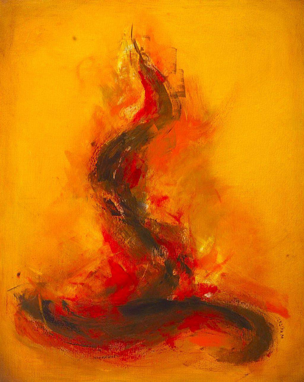 Obraz emanuje energią i ciepłem, które dosłownie wylewają się z płótna. Dominuje intensywna żółć tła, w której wyraźnie kontrastuje kurtyna rozedrganego czerwonego i czarnego. Te kolory tworzą dynamiczny wir, przypominający płomienie tańczące w kominku. Artysta używa technik impasto, co dodaje tekstury i głębi, jakby można było prawie dotknąć tego ognia. Czuć intensywność, jest też dziwnie uspokajający efekt, jakby chaos był w pewien sposób kontrolowany. Czy to nie przypomina ci czasem naszych własnych emocji? Myśli płyną jak woda, swobodnie, ale intensywnie. Styl obrazu jest abstrakcyjny, co pozwala odbiorcy na dowolną interpretację. Dziecko mogłoby powiedzieć: "To wygląda jak smoczy ogień!” I byłoby blisko, bo energia jest wręcz magiczna. Patrząc na ten obraz, można wyobrazić sobie, że jesteśmy na środku pustyni, a powietrze wokół nas drży od gorąca. Wow, co za vibe! Wydaje się, że artysta chciał uchwycić coś ulotnego, chwilowego, jak dziką muzykę wspomnień. Może to reprezentacja naszych wewnętrznych walk, pełnych pasji i niepokoju. Przypomina mi to, że nawet w chaosie można znaleźć piękno. Taka kombinacja kolorów i emocji może wywołać poczucie nostalgii lub nawet lekkiego niepokoju, ale jednocześnie zachęca do refleksji nad własnym wnętrzem. Bo kto wie, co kryje się w tych warstwach kolorystycznych.