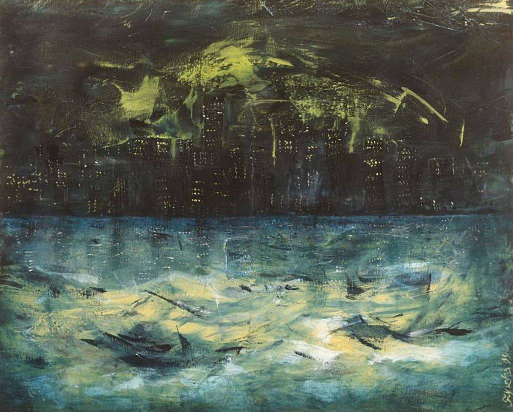 Obraz przedstawia nocne miasto nad wodą, z rozmytymi konturami budynków na horyzoncie. Dominują tu ciemne odcienie zieleni, niebieskiego i czerni, które nadają dziełu tajemniczy, nieco mroczny charakter. Światła w oknach drapaczy chmur są jak małe punkciki, migoczące w ciemności. Ta kolorystyka tworzy intrygujący kontrast z jaśniejszą powierzchnią wody, gdzie pociągnięcia pędzla w odcieniach żółci i bieli przypominają odbicia świateł. Kompozycja obrazu jest dynamiczna, a artysta używa technik takich jak impasto, co dodaje faktury i głębi. Atmosfera obrazu jest pełna skupienia i zadumy. Czuć jakby miasto tętniło życiem, nawet gdy śpimy. Styl artystyczny ma w sobie coś z ekspresjonizmu, z odrobiną abstrakcji, która pobudza wyobraźnię. Ten widok wywołuje w duszy pewną nostalgię. Jakby zapraszał do zadumy. Czy to miasto kiedyś nie spało? Dla dziecka obraz może przypominać magiczny świat pełen tajemnic. Wow, to jak noc u babci! Oglądając to dzieło, myślę o dynamice miasta, które nigdy nie zasypia. Jest w tym wszystkim coś nieuchwytnego, jakby eksplorując granice między światem rzeczywistym a snem. Może to dark city to nie tylko miejsce, ale też stan umysłu? Fascynujące połączenie kolorów i form wywołuje emocje. Człowiek czuje się jakby był częścią tego pulsującego miasta, a jednocześnie obserwatorem.