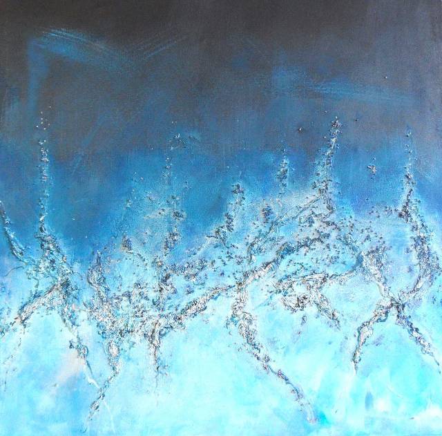 Na obrazie widać przepiękną grę kolorów, głównie odcieni niebieskiego, od jasnego błękitu po głęboki granat. Wygląda jak morskie fale unoszące się do nieba, a może to dym z bajecznej wulkanicznej erupcji? Kto wie! Kompozycja jest dynamiczna, z wyraźnymi, wijącymi się liniami przypominającymi błyskawice lub korzenie drzew. Obraz emanueje spokojem, ale zarazem budzi nutkę tajemnicy, jakby coś niezwykłego miało się za chwilę wydarzyć. Artysta zastosował tu techniki impasto, co nadje płynność i głębię. Tekstury są niemalże namacalne, a faktura powierzchni sprawia, że mamy ochotę dosłownie dotknąć dzieła. Całość oddaje uczucie wolności i przestrzeni, rzuca wyzwanie naszej wyobraźni. To jak marzenie, które jednocześnie znajduje się na granicy rzeczywistości i fantazji. Obraz może wywoływać mieszane emocje, od zachwytu nad jego pięknem po refleksję nad nieuchwytną naturą chwil ulotnych. Dla mnie osobiście jest jak okno do magicznego świata. Wow! Jedno dziecko może powiedzieć: "To wygląda jak niebo pełne fajerwerków!". I rzeczywiście – to "awesome"! Ten obraz naprawdę wciąga, trzyma na krawędzi.