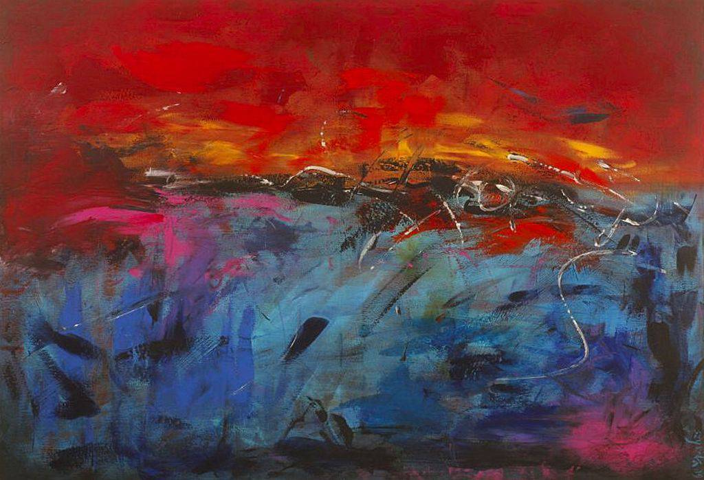 Ten obraz emanuje intensywnością i energią, niemal bijącą z jego płótna. Główne kolory to głęboki czerwony i ostry niebieski, które przeplatają się w dynamicznej kompozycji, przypominającej niebo otulające burzliwe morze. Czerwone i pomarańczowe plamy na górze obrazu przywodzą na myśl dramatyczny zachód słońca, podczas gdy niebieskie i fioletowe odcienie poniżej przypominają nieokiełznane fale. Jest tu spora dawka abstrakcji, z chaotycznymi liniami i smugami tworzącymi zmysłowy rytm. Atmosfera jest nieco burzliwa, jakby obraz chciał powiedzieć: "Czuj to!" Styl jest wyrazisty, a technika pędzla zdradza śmiałość artysty. Można dostrzec grube pociągnięcia farby, które nadają powierzchni teksturę. Ta faktura dodaje całej scenie ruchu, niczym fale na oceanie. A może to tylko moja wyobraźnia? Patrząc na ten obraz, można poczuć kalejdoskop emocji. Dla jednych może to być chaos, dla innych dynamiczna wolność. Obraz ten jest jak niepokorna myśl, która nie daje się ujarzmić. "Oh, wow!" – myśli dziecko, widząc ten wirujący świat barw. Ten kawałek sztuki jest dla mnie jak krzyk wiatru – dziki i nieposkromiony. Mówiąc wprost, to czysta energia i pasja zamknięta w ramy płótna.
