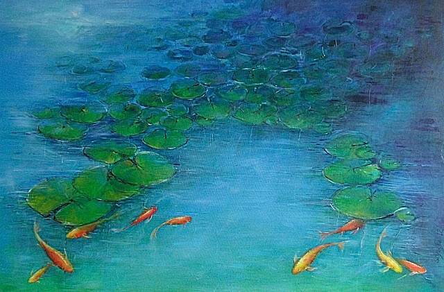 Na obrazie widzimy spokojną taflę wody, błyszczącą różnymi odcieniami niebieskiego i zieleni. Jest tak, jakby ktoś namalował spokój. Liście lilii wodnych unoszą się na powierzchni, tworząc zieloną mozaikę, która przyciąga wzrok. Kształty liści są nieregularne, ale to czyni je jeszcze piękniejszymi. Rybki koi, w kolorach pomarańczowym i złotym, swobodnie pływają pod nimi, dodając żywiołowy akcent do tej harmonijnej kompozycji. Całość emanuje spokojem i delikatnością. Istnieje głęboki nastrój ciszy, jakby cały świat na chwilę zamilkł. Patrząc na obraz, niemal słyszę cichy szum wody. Artysta zastosował technikę mieszania farb, co dodaje całości głębi. The texture is simply amazing! Pociągnięcia pędzla są miękkie, przez co obraz wydaje się prawie trójwymiarowy. Mały chłopiec powiedziałby: rybki wyglądają jak żywe! Ten obraz wywołuje spokój, relaks, może zadumę. Ktoś inny zobaczy w nim symbol harmonii natury. Patrząc na te kolory, zastanawiam się, jak piękny może być nasz świat, jeśli na chwilę się zatrzymamy i po prostu popatrzymy.