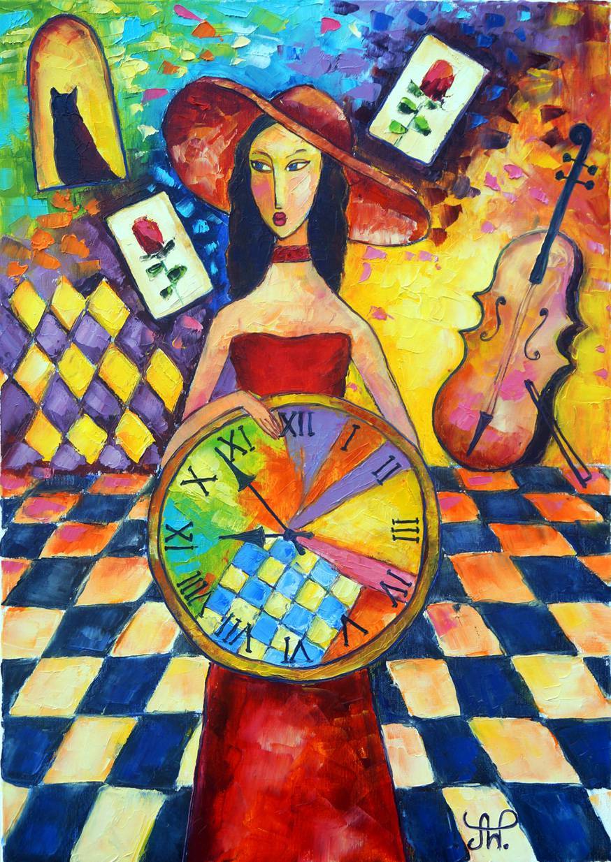 Obraz emanuje żywymi kolorami, przyciągając wzrok swoimi ciepłymi żółciami, czerwieniami i chłodnymi niebieskościami. Postać kobiety, ubrana w głęboką czerwień, wyróżnia się na tle dynamicznie ułożonego wzoru, przypominającego szachownicę. Kompozycja jest intrygująca i pełna kontrastów, mieszając geometryczne kształty z bardziej organicznymi formami, jak kontur wiolonczeli w tle. Spojrzenie postaci jest tajemnicze, a zegar, który trzyma, zdaje się mieć swój własny, zagadkowy czas. Można odczuć atmosferę magii i surrealizmu, jakby to była chwila zatrzymana w jakimś dreamlike świecie. Technikę tę wyróżnia faktura impasto, która dodaje obrazowi głębi i dynamizmu, a pociągnięcia pędzla są wyraźne i zdecydowane. Obraz może wywoływać uczucie zaciekawienia i wciągać w swoją historię, zadając pytania o tajemniczy upływ czasu. Po prostu wow, naprawdę dużo się tu dzieje. Jak patrzę na ten obraz, przypomina mi się książka o Alicji w Krainie Czarów, a może nawet trochę jak bajka. To jest like kiedy czas stoi w miejscu, a świat się kręci gdzieś obok. Każdy detal mówi coś innego, a całość tworzy unikalne dzieło sztuki, które zaskakuje i inspiruje.