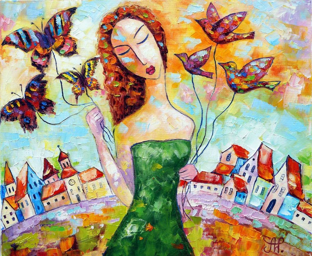 Obraz przedstawia kolorowy, magiczny świat pełen fantazji. Dominują na nim żywe barwy: pomarańcze, błękity, zielenie. Postać kobiety z delikatnymi rysami twarzy stoi w centrum, otoczona motylami i ptakami, jakby unosiła się w swoim marzeniu. Put simply, wygląda jak wróżka, której marzenia ożywają nad małym, bajkowym miasteczkiem w tle. Wieżyczki domów przypominają te z bajek, strzeliste i kolorowe. Atmosfera obrazu jest lekka i beztroska. Taki świat, gdzie troski nie mają miejsca. Kiedy na niego patrzę, czuję niesamowity spokój i radość. Artysta, stosując wyraźne położenie farby w stylu impastowym, sprawia, że wszystko wydaje się bardziej namacalne, żywe. Tekstura dodaje życia i głębi każdemu elementowi. Trochę jakby obraz wołał "dotknij mnie". Styl jest jakby z pogranicza snu i jawy, surrealizm w pełnej krasie. Obraz prowokuje do refleksji o wolności, o ucieczce od rzeczywistości. Ptaszki i motylki mogą symbolizować marzenia lub wspomnienia. A może przypominają lata dzieciństwa, gdy wszystko wydawało się możliwe i within reach? Takie obrazy sprawiają, że czuję się jak mały odkrywca w krainie czarów. Podziwiam artystę za umiejętność rozbudzania dziecka w każdym z nas. To jak powrót do domu po długim dniu, gdzie czujesz się bezpiecznie i szczęśliwie.