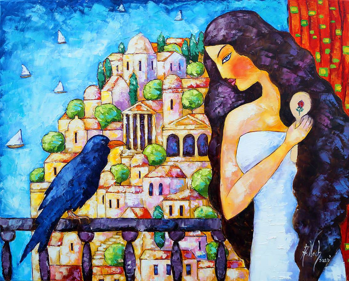 Piękna kobieta czesząca włosy i czarny kruk na tle pięknego pejzażu śródziemnomorskiego miasta.