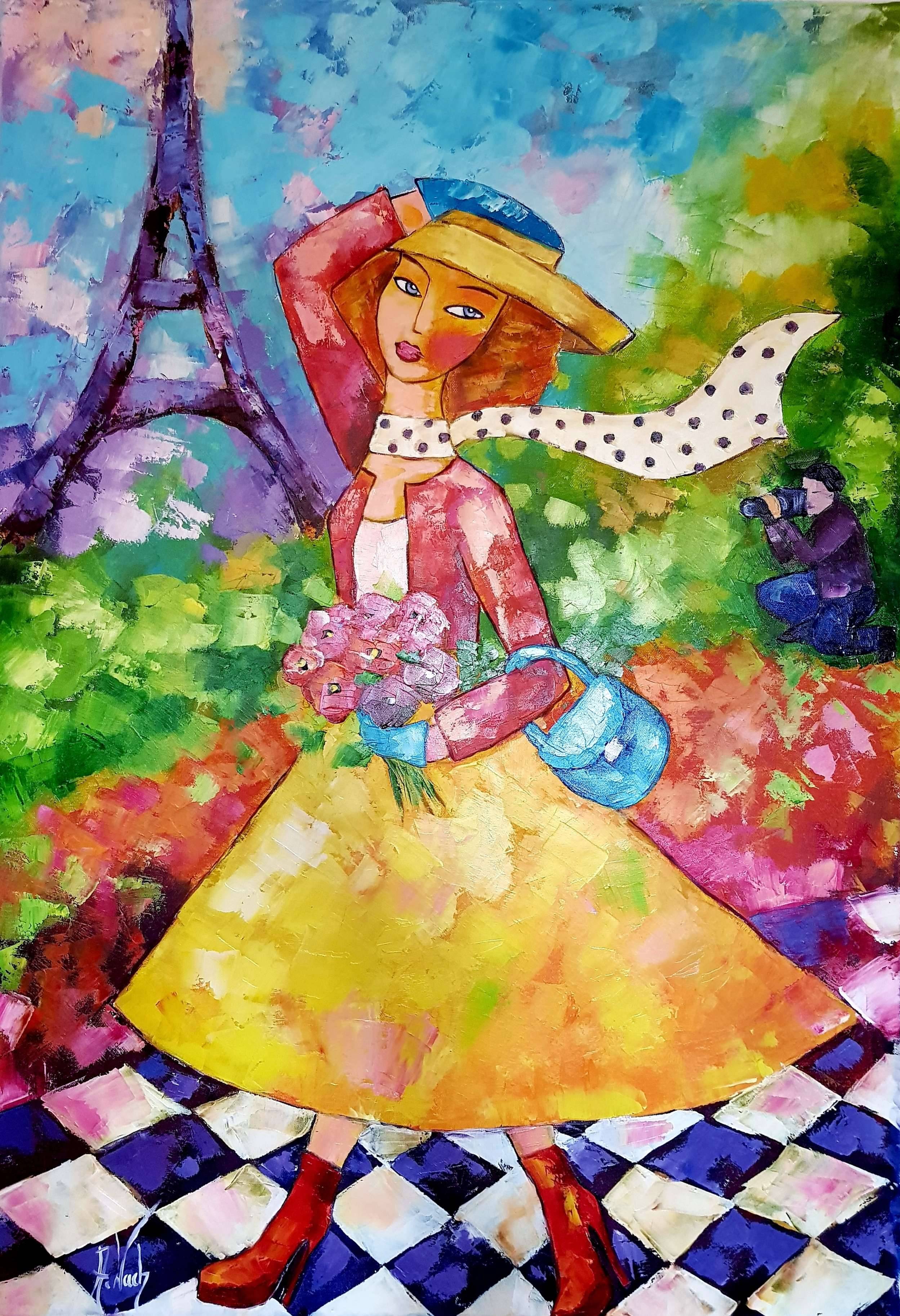 Na obrazie widzimy elegancką kobietę spacerującą w pobliżu wieży Eiffla, co nadaje całości paryski urok. Jej strój to połączenie jaskrawych kolorów: czerwonego płaszcza, żółtej spódnicy i niebieskiej torebki. Na głowie ma kapelusz, a na szyi powiewa biały szal w czarne groszki. W tle artysta umieścił fotografa, który z zainteresowaniem uchwyca jej wizerunek. Całość malowana jest szerokimi, dynamicznymi pociągnięciami pędzla, co nadaje obrazowi energię i ruch. Barwy są nasycone, niemal pulsujące, co wprowadza w radosny nastrój. Styl, choć nieco uproszczony, jest pełen ekspresji i żywiołowości. Można by powiedzieć, że ta scena jest jak żywy snapshot: vibrant i pełen życia. Patrząc na ten obraz, czujemy powiew wiatru i słyszymy śmiech przechodniów. Atmosfera dzieła jest lekka, pełna optymizmu. Artysta zastosował techniki przypominające impresjonizm, gdzie najważniejsze są światło i kolor, a nie szczegóły. Jest w tym coś ulotnego, coś, co skłania do refleksji nad chwilowością chwytanej emocji. Dla małego dziecka, ta scena może przypominać bajkowy spacer w parku pełnym kolorowych kwiatów. "Pani ma ładny kapelusz i uśmiecha się do pana z aparatem" – mogłoby powiedzieć siedmioletnie dziecko. Obraz wywołuje uśmiech, a nawet chęć wyjścia na podobny spacer. Cała scena tętni życiem, zachęca do marzeń i chwili oderwania od codzienności.