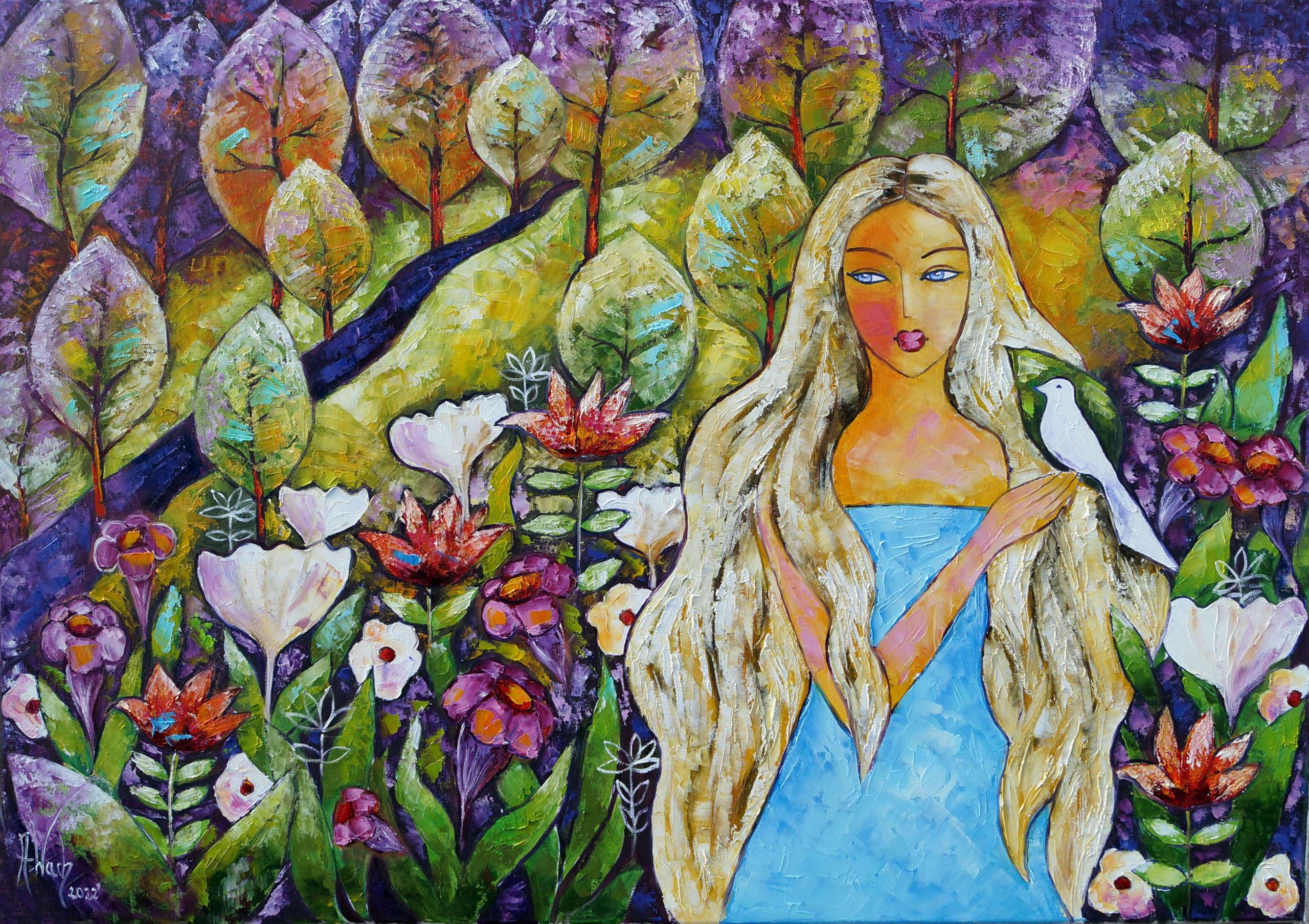 Piękna jasnowłosa kobieta z białym ptakiem na tle pejzażu kończącego się lata i nadchodzącej jesieni.
