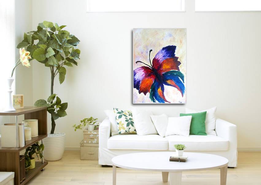 Oto niezwykłe dzieło sztuki, gdzie motyl rozpościera swe piękne, kolorowe skrzydła na tle delikatnie zamglonego nieba. Barwy są intensywne i pełne życia – od głębokiej purpury przez ostry pomarańcz po soczystą zieleń i błękit. Skrzydła zdają się tańczyć w powietrzu, tworząc dynamiczną kompozycję, która przyciąga wzrok i nie pozwala oderwać się od niej. Wygląda jakby motyl właśnie unosił się w powietrzu, wibrując pod wpływem wiatru. Atmosfera obrazu jest niezwykle lekka i radosna, emanuje energią oraz pewnym magic spirit. Patrząc na tę roztańczoną ferię barw, czujesz się jak dziecko odkrywające nowe światy. „O, motyl!” – mógłby zawołać maluch, wskazując na obraz z fascynacją. Technika artystyczna przypomina impresjonizm, z delikatnymi pociągnięciami pędzla, które nadają skrzydłom lekkiej struktury i głębi. Emocje? O, jest ich mnóstwo! Od zachwytu po zachętę do refleksji nad pięknem i ulotnością momentów. Tak, to momenty, które przypominają nam, jak wspaniałe i pełne niespodzianek jest życie.