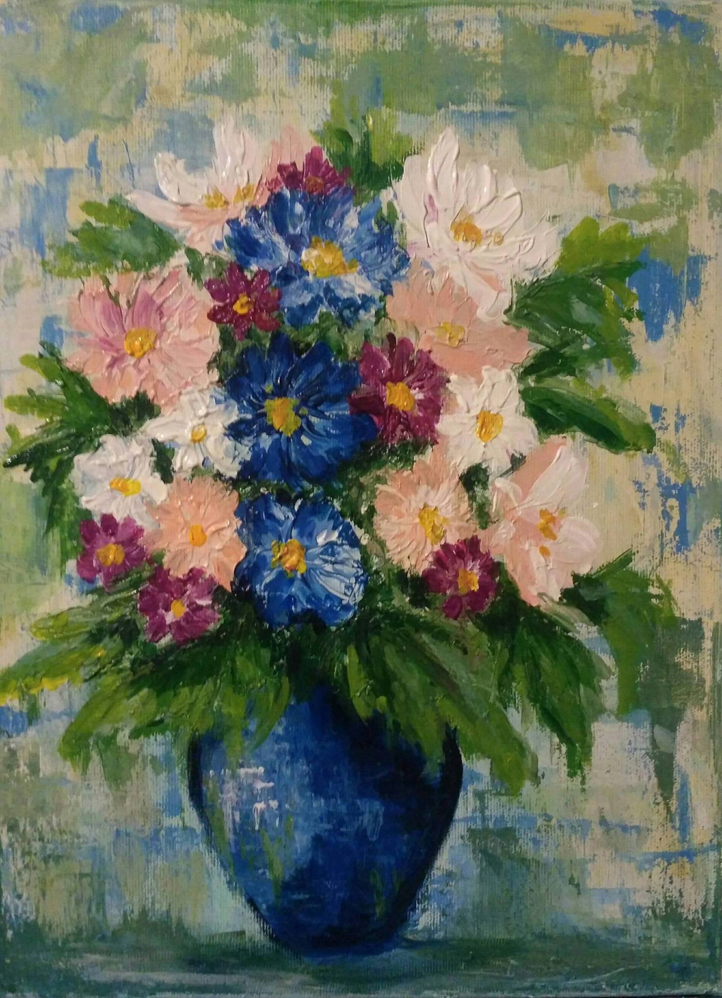 Na obrazie widzimy pełen życia bukiet kwiatów umieszczony w głębokim, niebieskim wazonie. Kwiaty, o różnorodnych kolorach: różowe, niebieskie, białe i fioletowe, eksplodują barwami na tle delikatnie rozmytej, zielono-niebieskiej ściany. Każdy z płatków wydaje się niemalże błyszczeć w świetle, a zielone liście dodają kompozycji świeżości i życia. Ta mieszanka barw tworzy harmonijną całość, ale też nie brakuje tu pewnej dzikości. Radosna, niemal wiosenna atmosfera aż bije od tego dzieła. Artysta zastosował technikę impasto, co sprawia, że kwiaty są niemal trójwymiarowe, wyrastając z płótna. To painting, które na pewno przyciągnie wzrok i wywoła uśmiech na twarzy obserwatora. Widz czuje się, jakby nagle znalazł się w środku małego ogródka pełnego kolorów i zapachów. „Patrz, kwiatki w wazonie!” – mogłoby krzyknąć zachwycone dziecko. Obraz wywołuje osobiste refleksje o pięknie natury i ulotności chwil. Czuć w tym lekkość i jakąś nieskrępowaną radość życia.