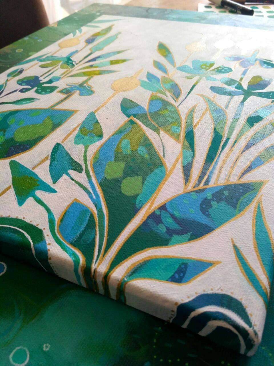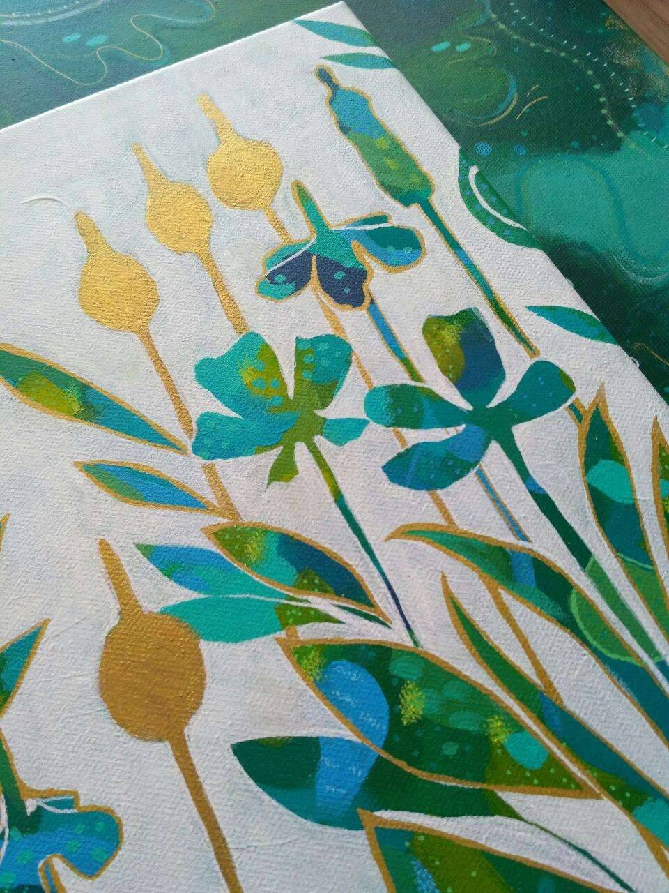 Obraz przedstawia abstrakcję roślinną. Złote detale mienią się w świetle. Kolory pięknie kontrastują z białym tłem. Akryl, markery posca i pastele olejne na płotnie. Obraz ma zamalowane boki jako kontynuacja obrazu. Zawerniksowany.