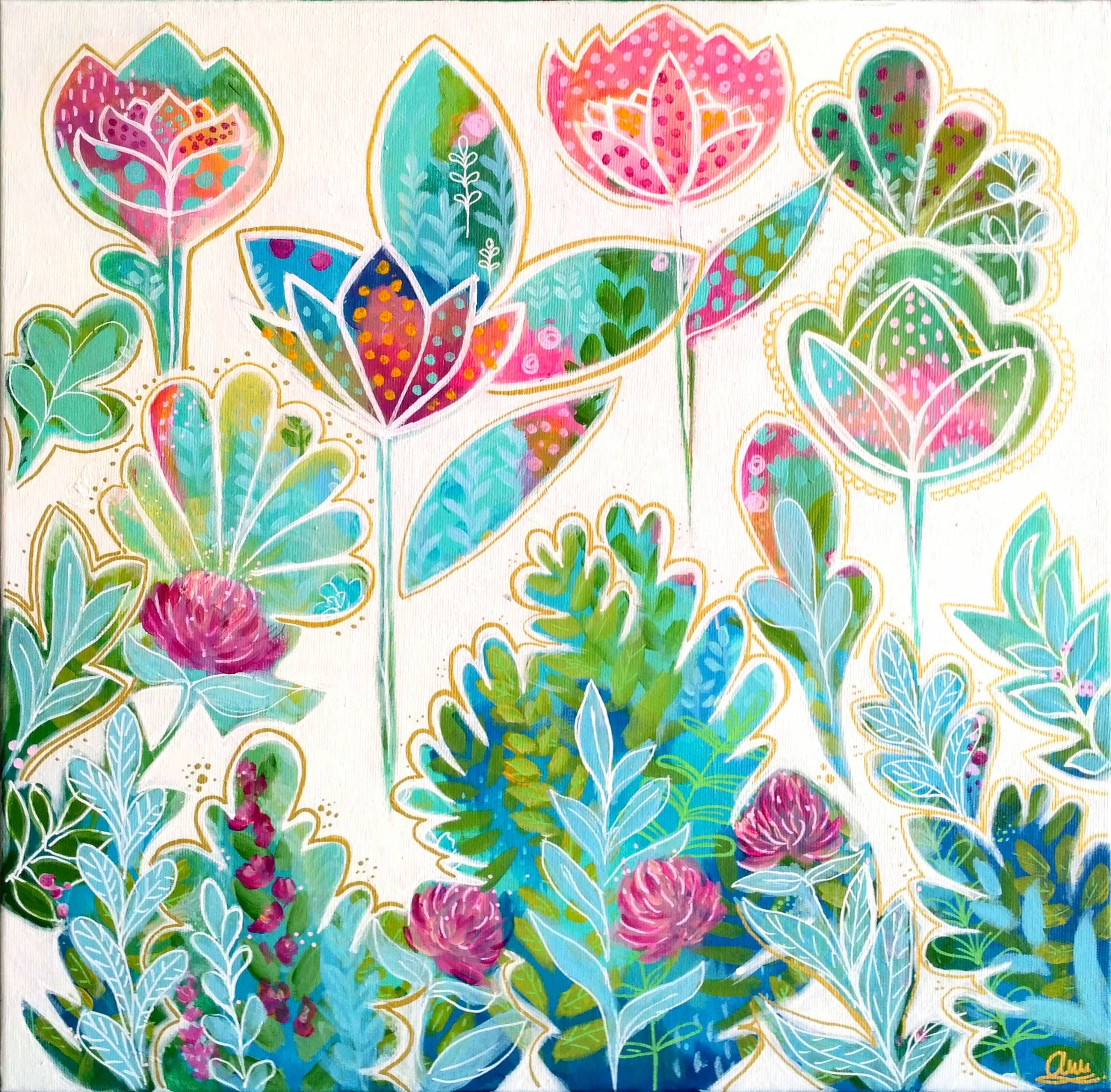 Obraz przedstawia feerię kolorów – różowy, niebieski i zielony pląsają na płótnie, tworząc radosną kompozycję przypominającą kwiatowy ogród. Kwiaty są jakby wyjęte z bajki, z dużymi, fantazyjnymi płatkami i liśćmi, które wydają się falować na wietrze. Atmosfera jest lekka, niemal magiczna, emanuje z niej ciepło i pozytywna energia. Artysta wykorzystał technikę akrylową, która nadaje całości matowej tekstury, podkreślając żywe barwy. Kreuje wrażenie lekkości, jakby każdy element miał unosić się w powietrzu. To połączenie stylu folkowego z nowoczesnym podejściem do formy i koloru. Uważam, że obraz przypomina trochę senne marzenie. Mały Jaś powiedziałby: "Te kwiatki wyglądają jakby się śmiały!" Wzory i detale dodają głębi, przyciągając oko do każdego szczegółu. W miarę przyglądania się, można poczuć dziecięcą radość i beztroskę. Jest coś magicznego w tej harmonii, która łączy prostotę z bogactwem. Ta praca to istna eksplozja "happiness", którą trudno zignorować.