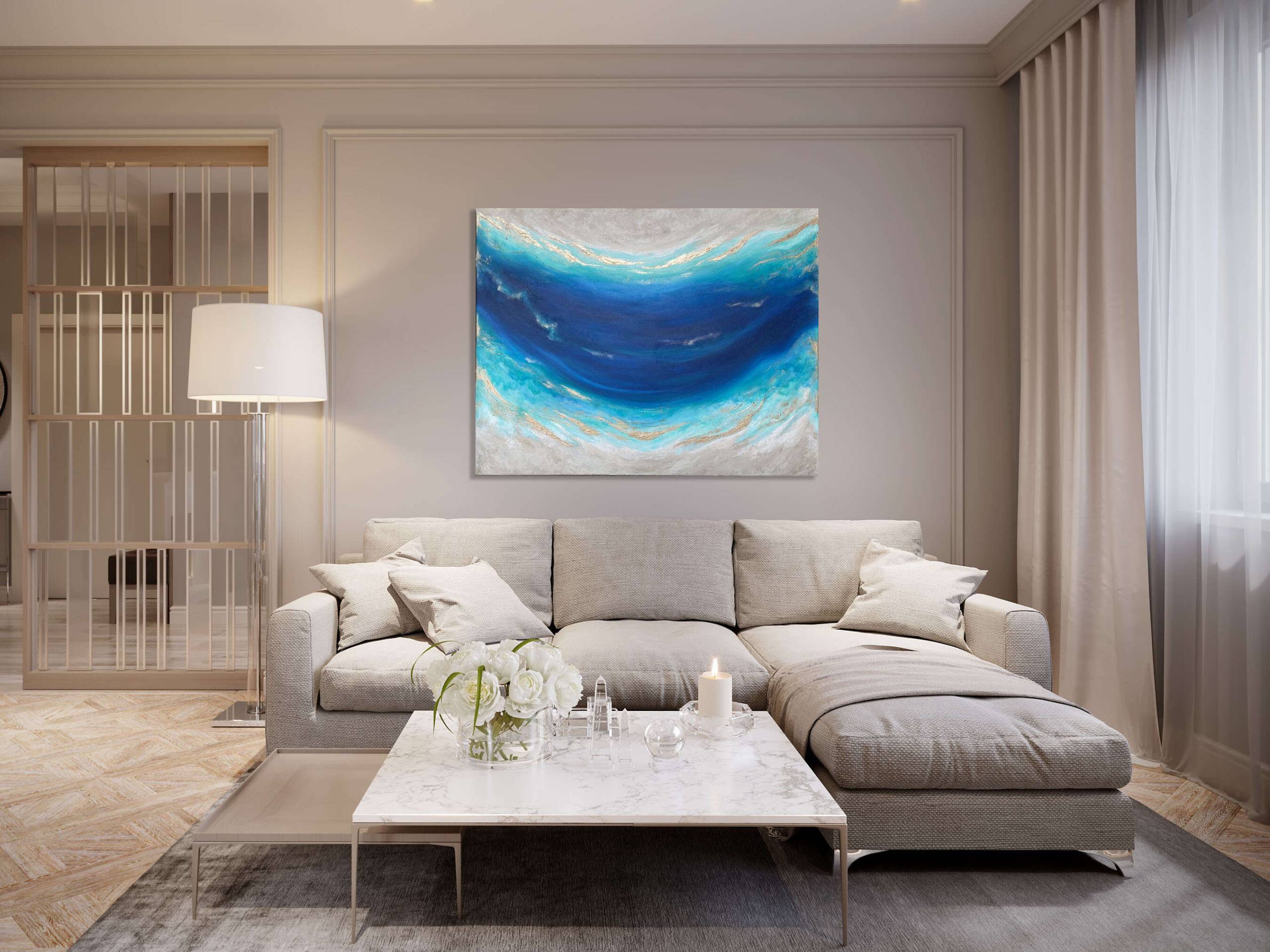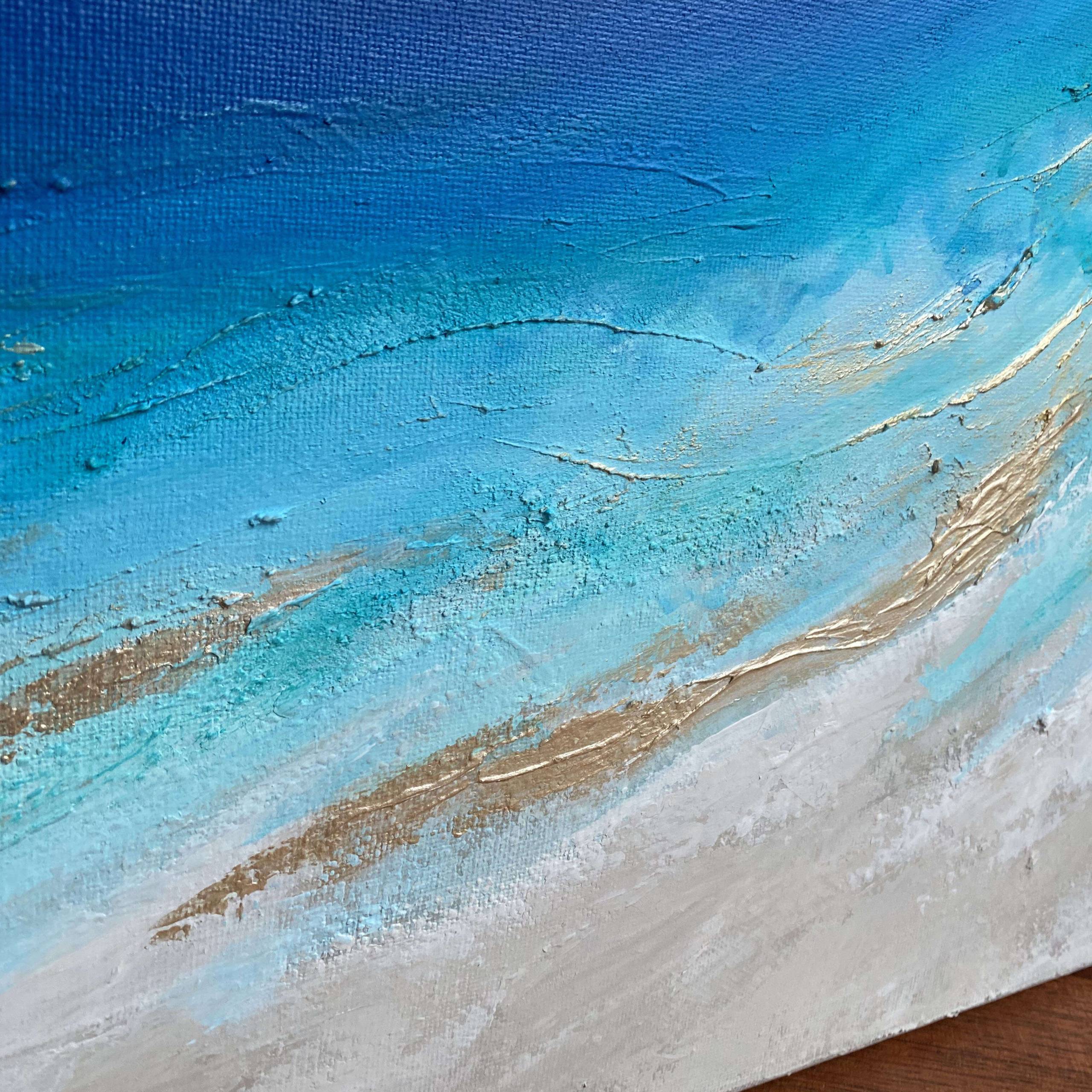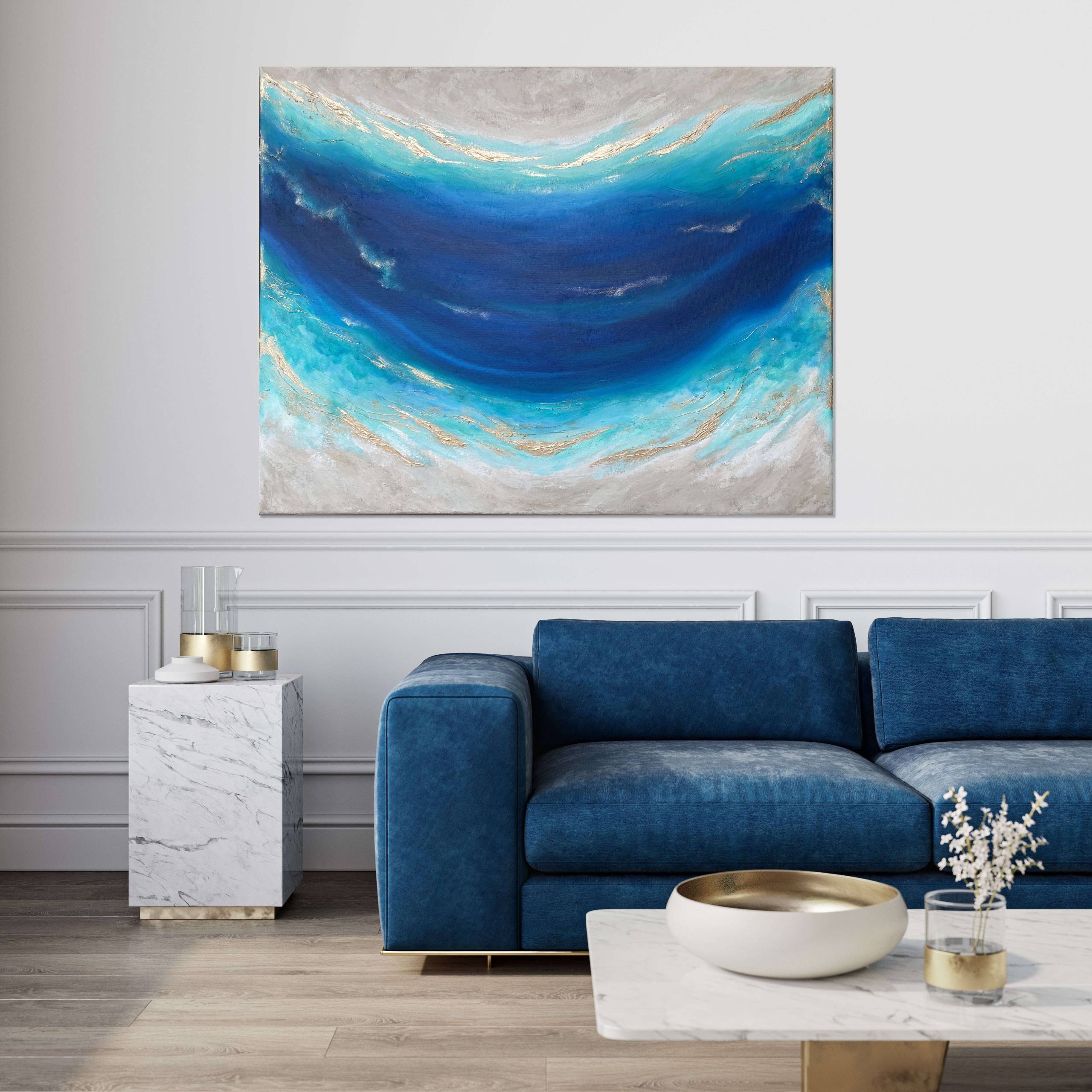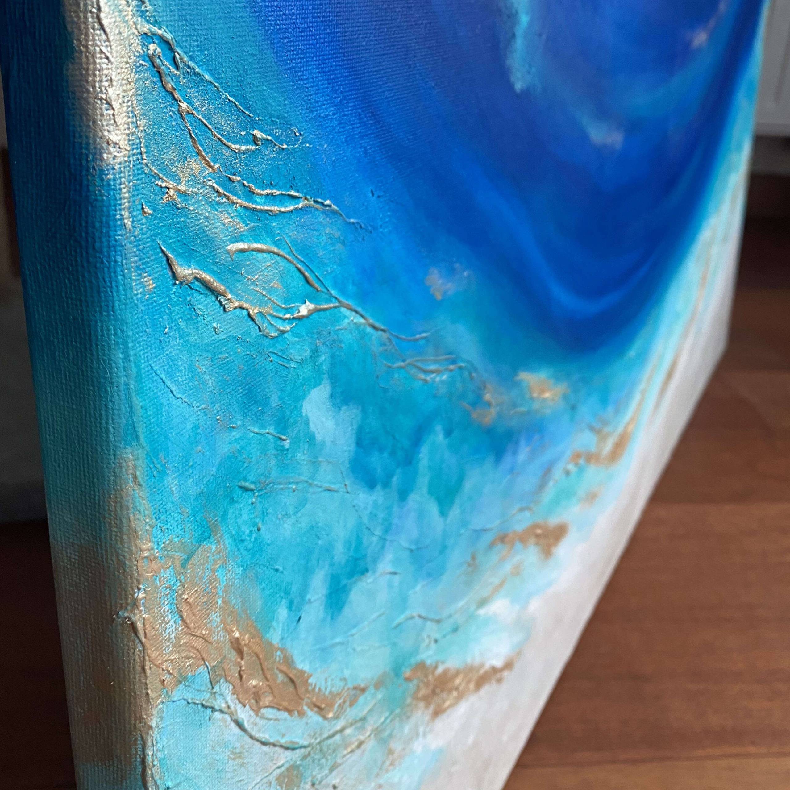 Abstrakcyjny obraz do salonu "Maldives XIX" autorstwa Anny Wawrzyniak - Annsayuri ART. Jest to jeden z 14 obrazów powstały w kolekcji Maldives powstałej w 2023 roku. Obrazy z cyklu Maldives są inspirowane pięknem lazurowych wybrzeży i natury. Patrząc na nie czuję się zrelaksowana i spokojna. Tak samo, jakbym leżała na słonecznej plaży, słuchając szumu fal, rozkoszując się promieniami słońca i kolorami otaczającej natury. Błękitne niebo nade mną i nieskończony horyzont. A we mnie wewnętrzny spokój oraz błogie uczucie nieograniczonej przestrzeni i nieskończonych możliwości. Mam nadzieję, że dzięki tym obrazom poczujesz to samo co ja i zechcesz zatrzymać to uczucie na dłużej! Oryginalny, ręcznie malowany nowoczesny obraz akrylowy z dodatkiem złotej metalicznej farby. Obraz został namalowany głównie szpachelką oraz z użyciem pasty strukturalnej. Ciekawa faktura oraz mieniąca się w świetle złota farba nadają temu obrazowi niezwykłego charakteru. Dominujące kolory: granatowy, niebieski, turkusowy, błękitny, beżowy, biały, złoty Obraz został namalowany na włoskim płótnie bawełnianym 70x90cm Media: akryl, pasta strukturalna Obraz jest werniksowany - zabezpieczony przed blaknięciem i kurzem. Boki obrazu są zamalowane w tonacji, obraz nie wymaga oprawy. Sygnowany. Zamontowana linka do powieszenia obrazu.