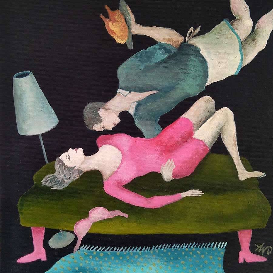 Obraz przedstawia scenę pełną kontrastów i dynamiki. Dominują w nim intensywne kolory – soczysta zieleń kanapy, jaskrawy róż sukienki kobiety oraz ciemne tło, które sprawia, że te barwy jeszcze bardziej się wyróżniają. Postacie zdają się być zamrożone w emocjonującym momencie, jakby czas się zatrzymał. Atmosfera jest nieco surrealistyczna, jakby wkradał się do niej element snu lub marzenia na jawie. Styl artystyczny przypomina nieco kubizm, z odważnymi kształtami i nieco zniekształconymi proporcjami. Artysta użył efektów wizualnych, które sprawiają, że patrząc na obraz, czuć równocześnie niepokój i fascynację. Wow, to naprawdę wygląda jak coś z bajki. Patrząc na to dzieło, można poczuć nutkę tajemnicy i zastanowić się, co tak naprawdę się tam dzieje. To wszystko sprawia, że obraz jest engaging i pełen życia. Kto by pomyślał, że taki utwór może wzbudzić tyle emocji?