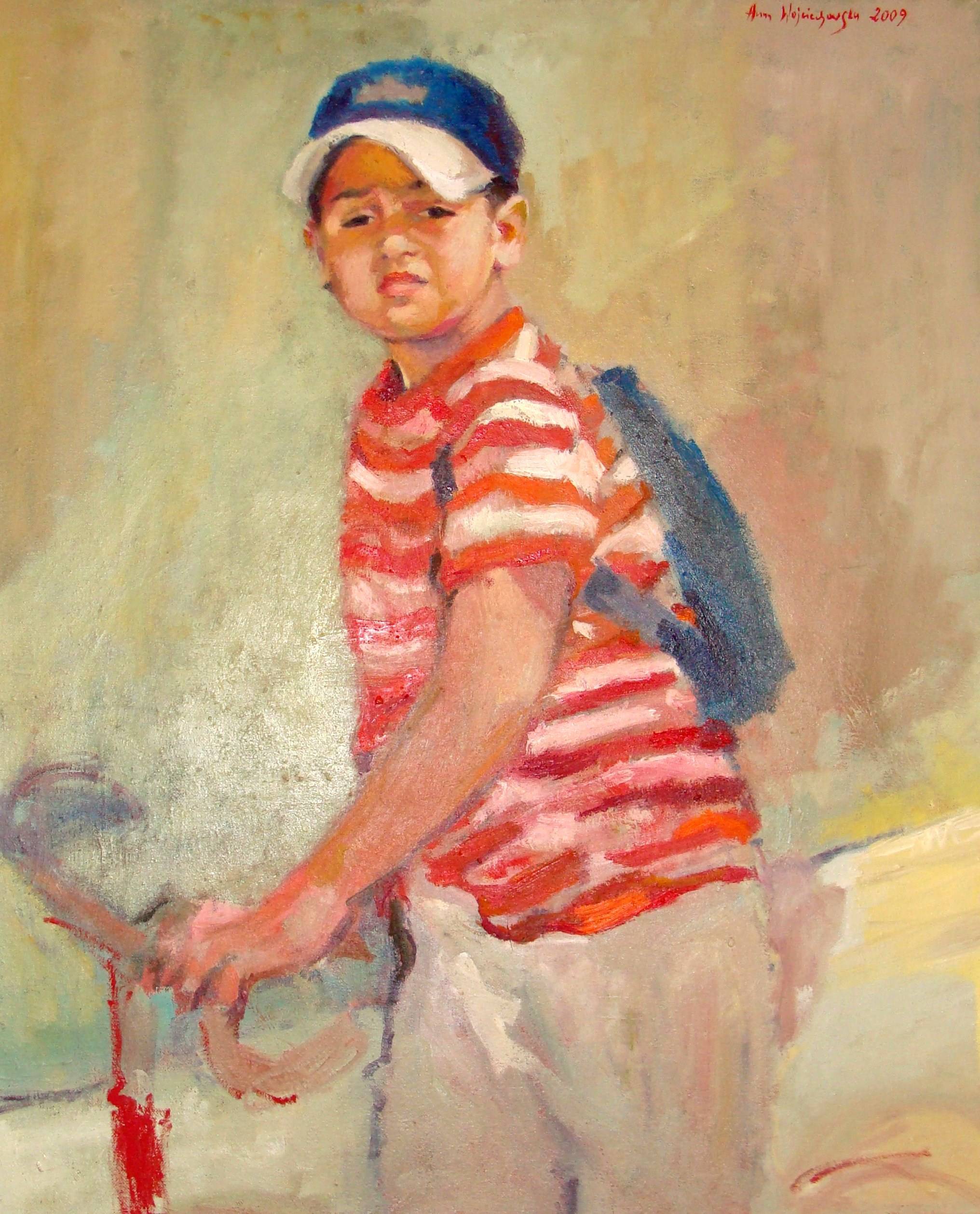 Chłopiec z rowerem to portret dziecka . Obraz w ciepłych kolorach , postać potraktowana impresjonistycznie