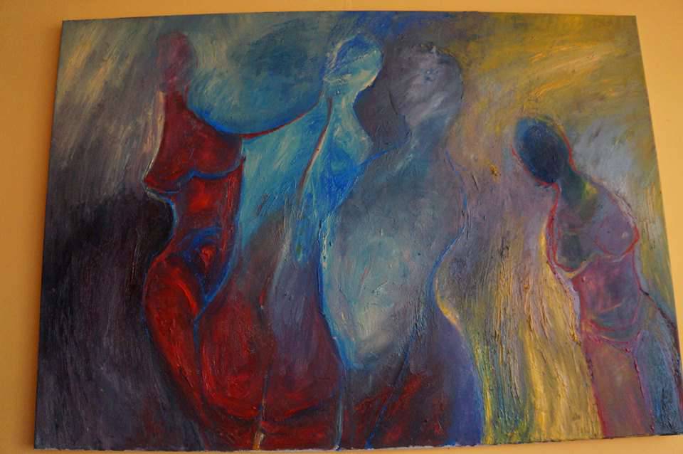 Obraz emanuje tajemniczą aurą, napawającą obserwatora mieszanką fascynacji i niepewności. Kolory przenikające dzieło to intensywne czerwienie, chłodne błękity i głębokie fiolety, które kłębią się niczym ruchome cienie w półmroku. Subtelne przejścia barw są jak szept, który nagle przerywa ciszę. Widać zarys sylwetek, które tańczą w dynamicznym ruchu. Kształty są płynne, falujące, jakby pod wpływem wiatru. Look, to prawdziwa symfonia kolorów! Styl artystyczny jest mocno ekspresyjny, z wyraźną inspiracją impresjonizmem. Grube pociągnięcia pędzla tworzą fakturę, która niemalże zaprasza do dotknięcia płótna. Technika impasta daje obrazowi żywiołowość i trójwymiarowość. Poczucie ruchu i tajemnicy wprowadza napięcie, jakby za chwilę miało się coś wydarzyć. Odbiorca może odczuwać całą gamę emocji. Z jednej strony może to być spokój wynikający z harmonii kolorów, z drugiej jednak lekkie niepokojenie, bo co to za postacie? Jakie jest ich znaczenie? Siedmioletnie dziecko mogłoby powiedzieć, że te figury wyglądają jak duchy tańczące w magicznym ogrodzie. Moje osobiste odczucia są mieszanką fascynacji i zadumy nad ukrytą opowieścią, którą dzieło zdaje się szeptać. Obraz jest żywy, wciągając do świata barwnych emocji. Trudno przejść obok niego obojętnie.