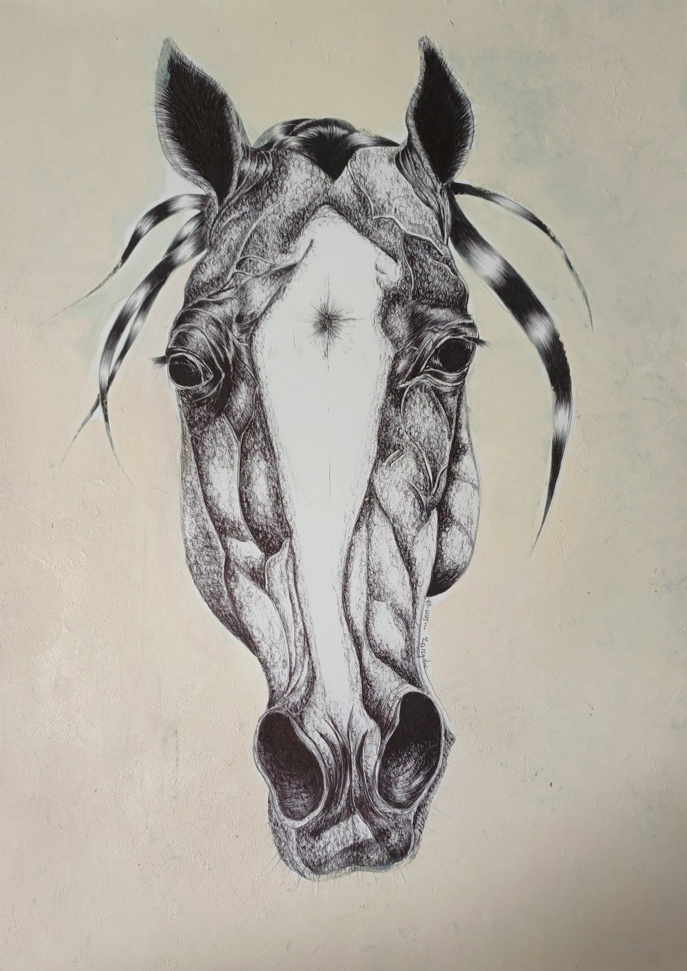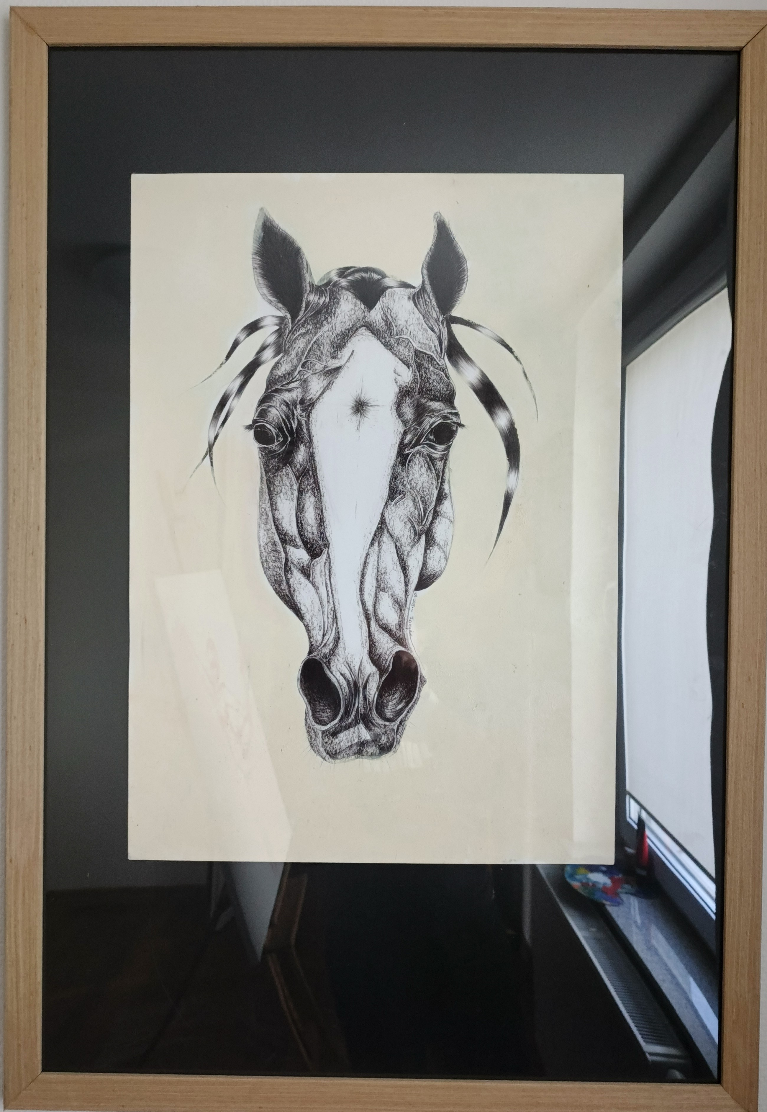 Obraz przedstawia głowę konia, przy czym wykonany jest z dbałością o najmniejsze detale. Użyta głównie czarna linia kontrastuje z jasnym tłem, podkreślając wyrazistość rysunku. Kompozycja skupia się na twarzy konia, która wydaje się być pełna dostojności i siły. Uchwycenie oczu, uszu i nozdrzy nadaje mu niemalże realistyczny wyraz. Artysta zastosował technikę rysunku piórkiem, co dodaje delikatności i finezji całemu dziełu. Atmosfera obrazu jest spokojna, ale jednocześnie dynamiczna. Czujemy, jakby koń spoglądał gdzieś w dal, a jego wzrok przeszywał przestrzeń, co tworzy pewne napięcie. Całość emanuje elegancją, ale i pewną dzikością. Człowiek patrzy i się zastanawia: dokąd ten koń patrzy? Styl artysty, który zdaje się być mieszanką realizmu i stylizowanej grafiki, przyciąga uwagę i skłania do refleksji. Te detale, te wszystkie kreski! Może nawet wprowadzić widza w stan zadumy nad naturą i pięknem świata zwierząt. Jest to coś, co pasjonuje zarówno dorosłych, jak i dzieci – “Koniowi zawsze smutno z oczu patrzy!” powiedział by 7-latek. Może odczuwam trochę nostalgii, patrząc na jego spojrzenie. Mieszanka artystycznego kunsztu i emocjonalnego przekazu sprawia, że obraz ten to nie tylko dzieło sztuki, ale także swoisty "conversation starter". Coś, co sprawia, że chce się więcej.