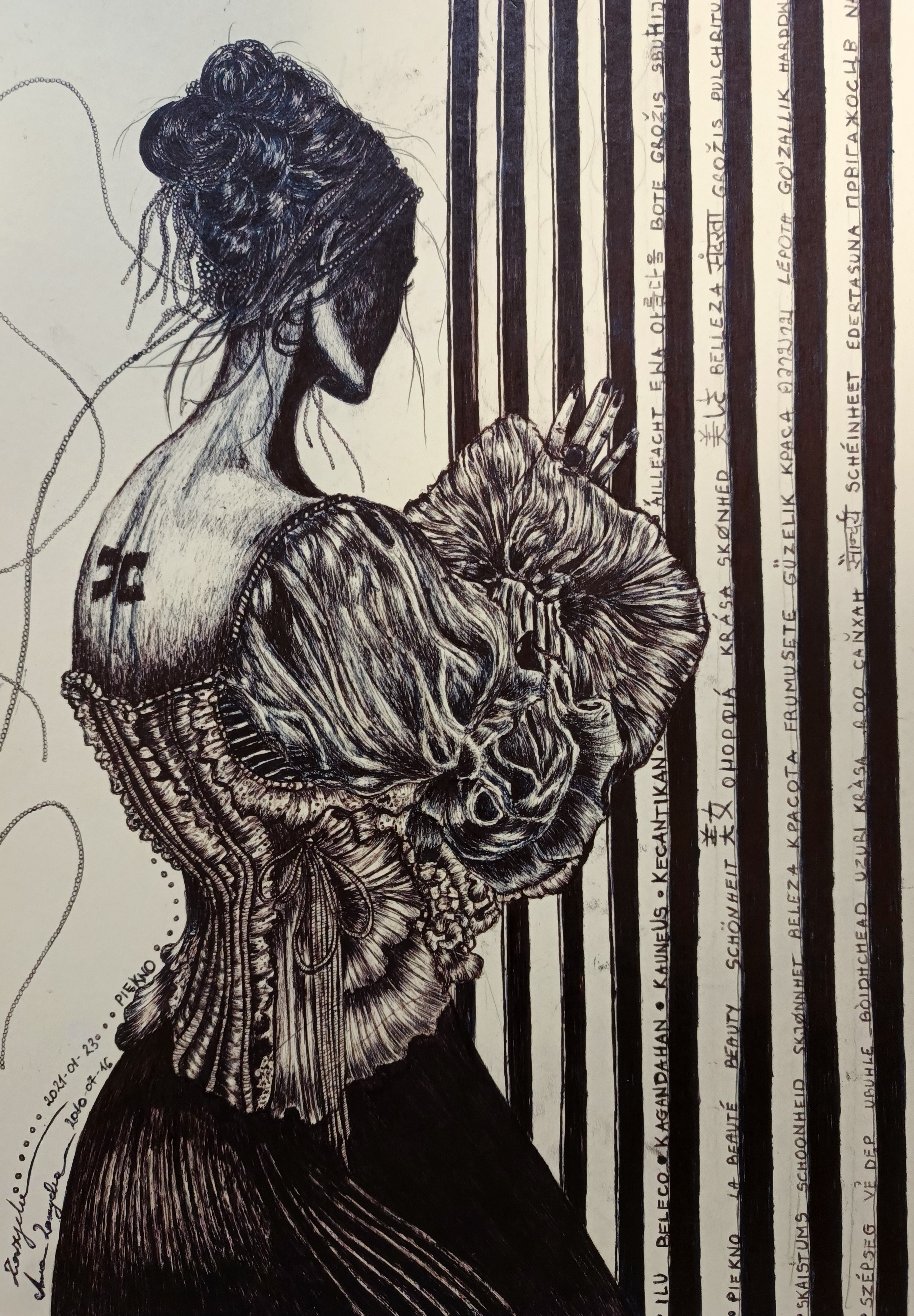 Na obrazie widzimy kobietę, której postać ujarzmiona jest w delikatnych, koronkowych liniach. Tło stanowią pionowe, ciemne paski, które kontrastują z jasnym odcieniem sylwetki. Czerń i biel dominująca w pracy nadaje obrazowi tajemniczego, niemal gotyckiego klimatu. Podziwiam detale sukni, które wyglądają jak biegnące fale materiału, oplatające jej ciało z finezją i kunsztem. Włosy upięte są w misterny kok, z paroma kosmykami swobodnie opadającymi, jakby uchwyconymi przez wiatr. Nastrój dzieła jest melancholijny, jakby bohaterka skrywała swoje myśli za zasłoną nieodgadnionego zamyślenia. Czy ona myśli o wczorajszym deszczu, a może o tajemnicy przenikającej jej życie? Styl artystyczny wydaje się zainspirowany klasycznym rysunkiem, z naciskiem na chiaroscuro – gra światła i cienia tworzy napięcie. Patrząc na tę pracę, można poczuć tęsknotę, ale i spokój. Jest w tym coś z "vintage beauty", jakby wyjęto ją z dawno zapomnianego albumu. Osobiście czuję, że praca ta przypomina mi, jak subtelność i detale mogą opowiadać historię bez słów. Cokolwiek artysta chciał przekazać, udało mu się uchwycić intensywność ludzkich emocji. Na tym obrazie artystka użyła słowa "piękno" w 50 różnych językach, zapisanych na pionowych panelach okiennych.