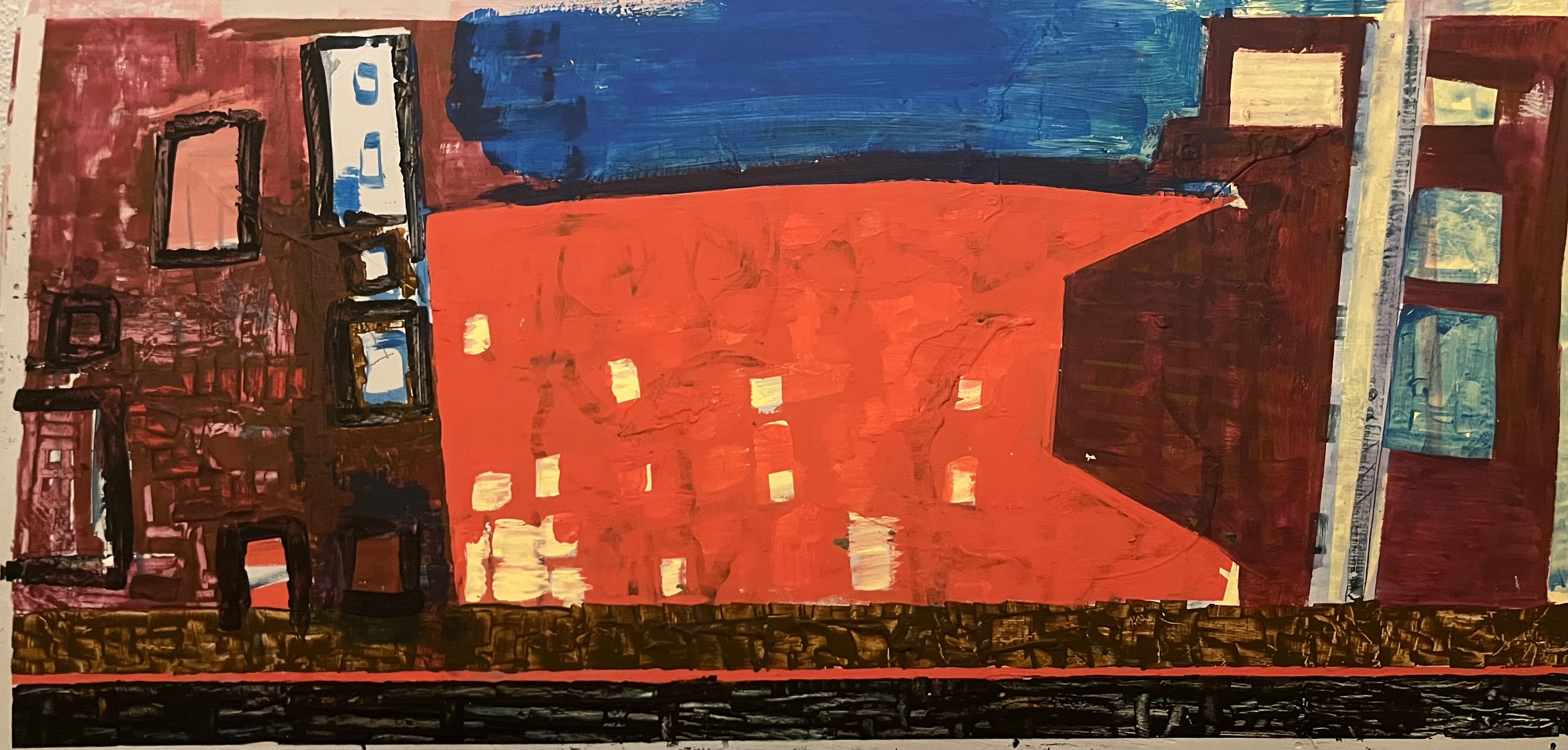 Obraz emanuje energią, którą aż trudno opisać słowami. Dominują kolory ciepłe, z przewagą nasyconej czerwieni i głębokiego brązu. Przez środek tła przewija się błękitna plama, jakby artysta chciał dodać oddech przestrzeni. Kompozycja jest dynamiczna, kształty są nieregularne, co nadaje dziełu charakteru. Wygląda, jakbyśmy patrzyli przez okno na miasto, które nigdy nie śpi. Ta abstrakcyjna scena przyciąga wzrok, przywodzi na myśl niekończący się zgiełk ulic i magię neonów. Styl jest zdecydowanie ekspresjonistyczny. Wyraźne, grubo nakładane warstwy farby zdradzają technikę impasto, nadając obrazowi trójwymiarowości. Każdy pociągnięcie pędzla pełne ekspresji, niczym emocjonalne krzyki artysty przelane na płótno. Czujesz to? Jest tu coś, co sprawia, że serce bije szybciej.