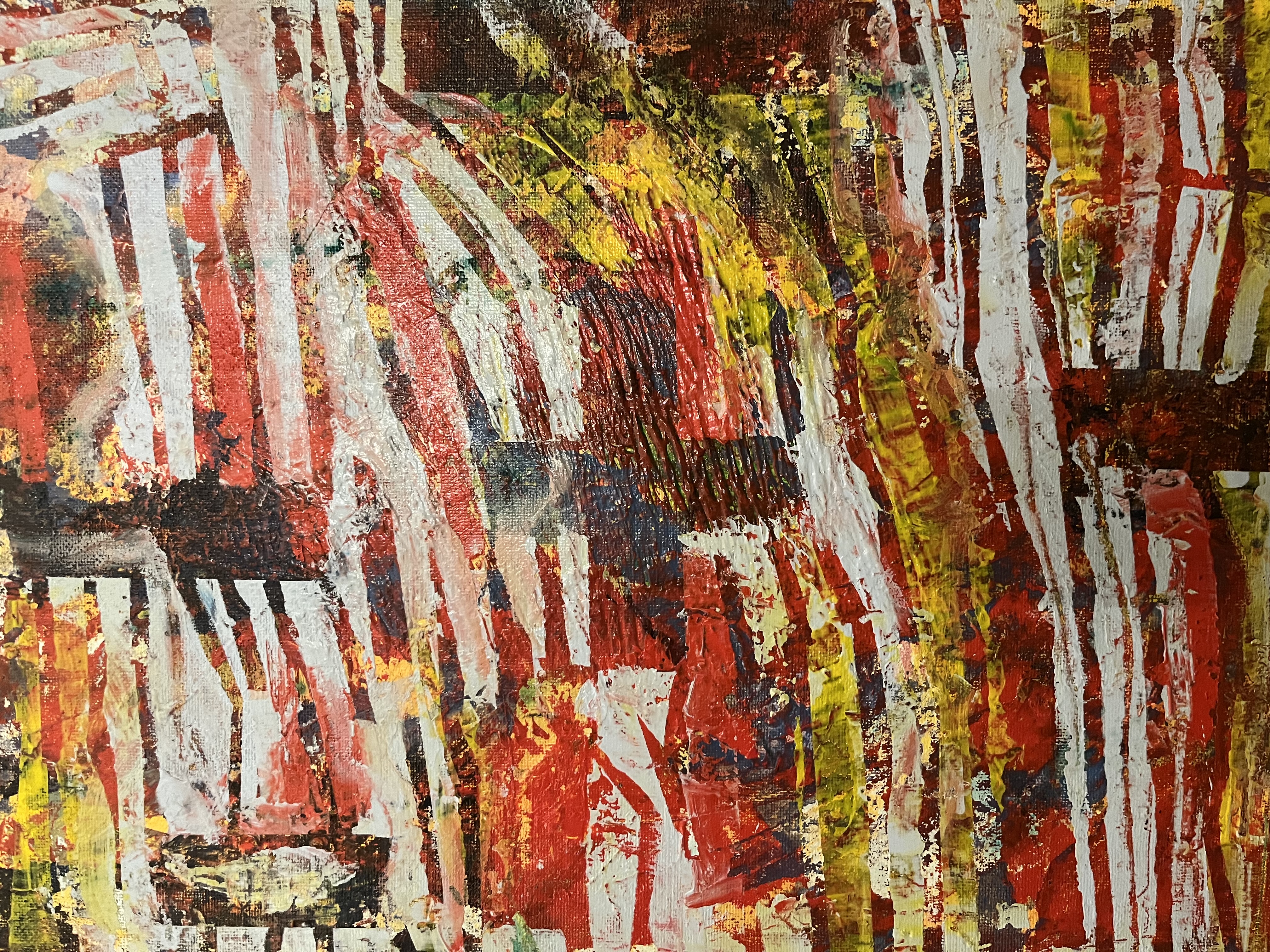 Obraz to istne szaleństwo kolorów. Przede wszystkim ciepłe odcienie czerwieni i żółci, które wirują i przelewają się w kompozycji pełnej energii. Na pierwszy rzut oka chaos, ale w tym właśnie tkwi jego urok. Dominuje dynamiczny układ poziomych pasów, które przeplatają się z białymi i ciemniejszymi akcentami. To jakby artysta postanowił zanurzyć nas w wirze ognia. Styl jest niewątpliwie ekspresyjny. Na pierwszy plan wysuwają się grube pociągnięcia pędzla i faktura farby, która miejscami zdaje się wręcz pulsować. Warsztat artystyczny skupia się na spontaniczności i luzie twórczym, co nadaje całości pewnego rodzaju "freedom". Gdy się w to wpatrujesz, można poczuć, jakby obraz krzyczał pasją.