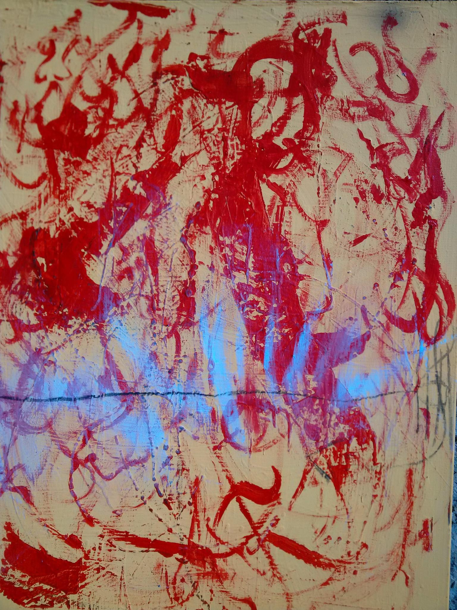 Na obrazie dostrzegamy zaskakującą mieszaninę barw i kształtów. Dominują intensywne czerwienie, które wirują na tle beżu, tworząc dynamiczną kompozycję. Gdzieniegdzie pojawiają się subtelne, niebieskie smugi, które dodają głębi i kontrastu. Całość jest pełna ekspresji, jakby artysta próbujeł uchwycić chwile uniesienia i chaosu. Technika malarska z pewnością przyciąga wzrok. Wygląda to jak spontaniczne ruchy pędzla, może nawet palców, które pozostawiły ślady emocji na płótnie. Atmosfera obrazu jest energetyczna, pełna życia, emanuje niepokojem, ale i ekscytacją. Czuję, że ten chaos ma swoje miejsce. Można tu poczuć bijące serce artysty. Styl przypomina abstrakcyjny ekspresjonizm, gdzie ważniejsze jest to, co czujemy niż to, co widzimy. Czuję się trochę jak w grze w układanie chaosu. Dla dziecka obraz może wyglądać jak radośnie rozsmarowany dżem na kanapce, a to "coś" niebieskiego jest jak magiczna różdżka. To "art" w czystej postaci. Emocje kipią i zmuszają do refleksji nad własnym miejscem w tym skomplikowanym świecie.