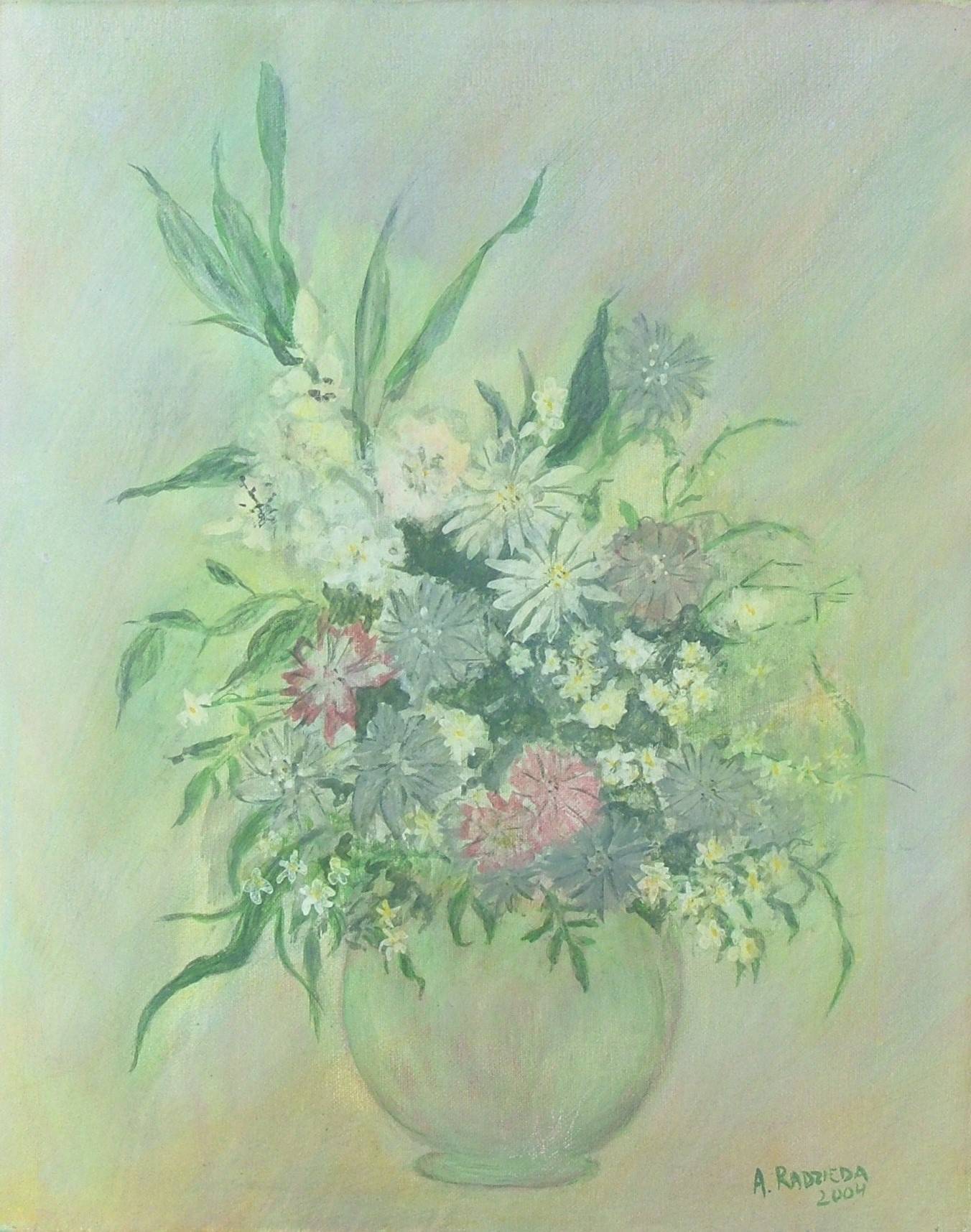 Obraz przedstawia subtelny bukiet kwiatów osadzony w matowym, zielonkawym wazonie. Dominują delikatne pastelowe barwy, takie jak stonowane zielenie, biele, szarości i nieco czerwieni. Całość jest jakby otulona mgiełką nadającą pracy ulotny, niemal magiczny charakter. Trochę tak jak mgławica w odcieniach zieleni i różu. Kwiaty zdają się lekko kołysać na wietrze, nadając całości dynamiki mimo statycznej kompozycji. Artysta zastosował delikatne pociągnięcia pędzla, by podkreślić lekkość i kruchość kwiatów. To obraz, który spokojnie można nazwać "serene", bo faktycznie emanuje spokojem i delikatnością. Dla niektórych może to być przypomnienie o przemijaniu i pięknie natury. Patrząc na to dzieło, można poczuć ciepło i elegancję, jakby artysta chciał nas uspokoić. Jakiś dziwny rodzaj nostalgii unosi się w powietrzu. A kwiatki są ładne, bo są kolorowe i śliczne! To może być idealne na popołudnie z kawą, kiedy chcesz na chwilę zapomnieć o całym świecie.