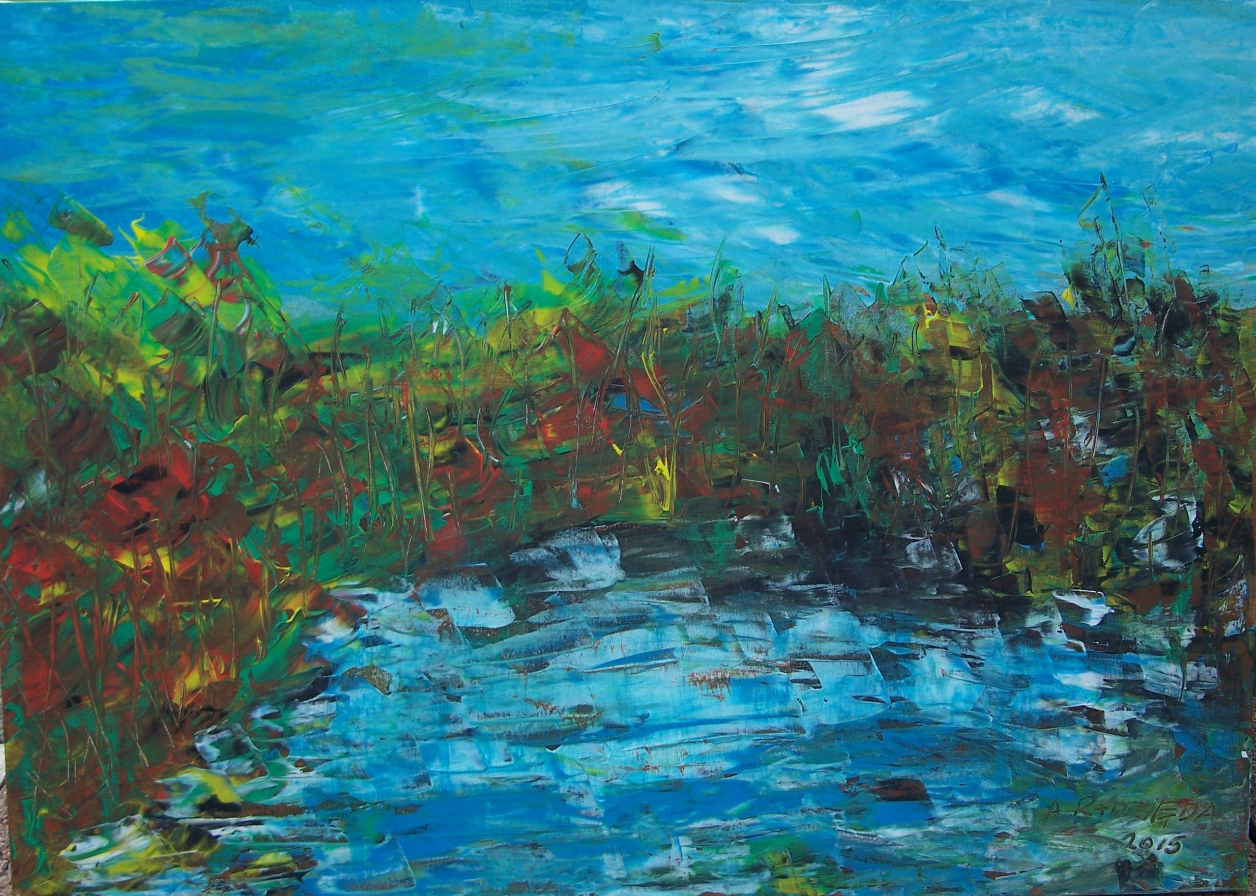 Abstrakcja bardzo kolorowa, przypomina pejzaż bardzo piękny, na którym można zobaczyć co się chce.