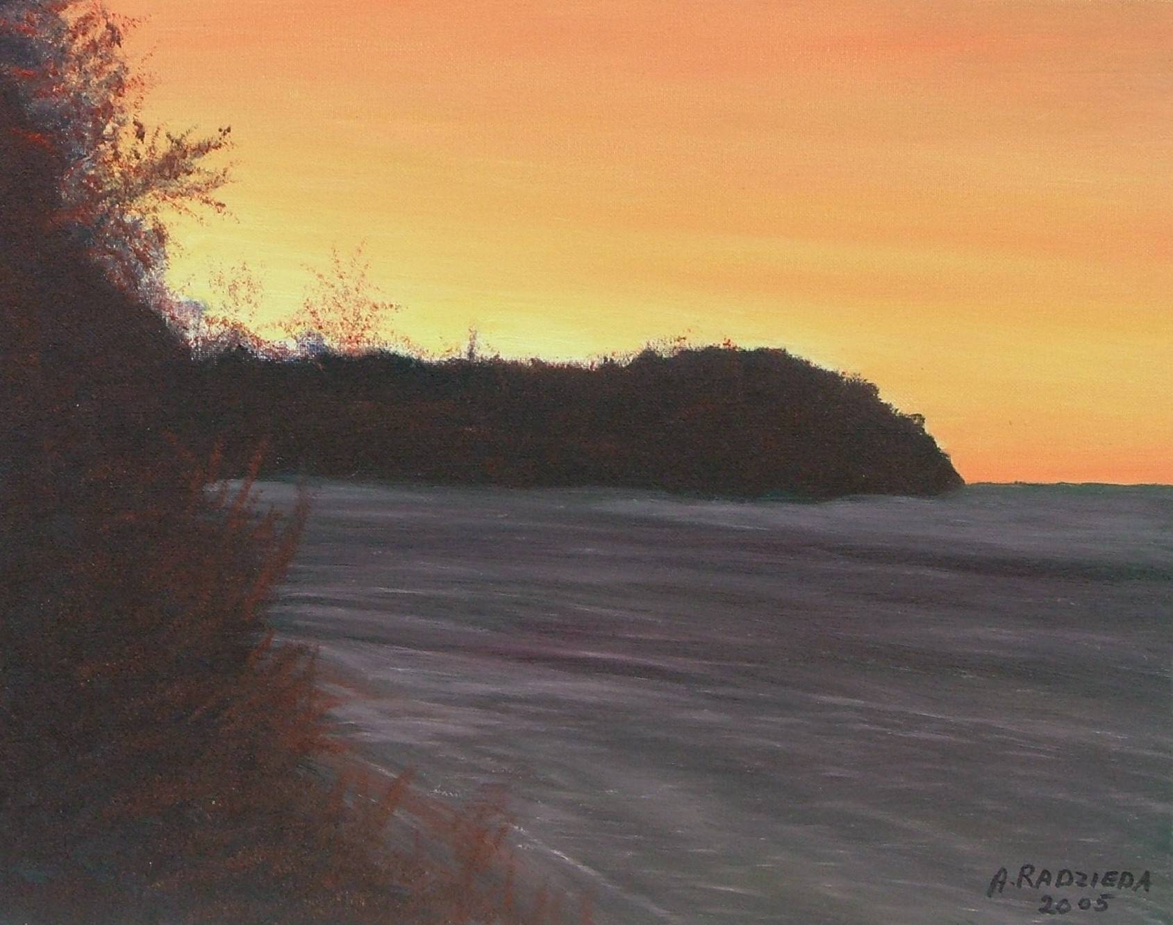 Na tym obrazie widzimy zapierający dech w piersiach zachód słońca. Ciepłe, pomarańczowe niebo płynnie przechodzi w delikatne żółcie, które rozlewają się nad horyzontem. Na pierwszym planie ciemne zarysy krzaków i drzew tworzą kontrast z jasnym tłem, dodając kompozycji głębi i tajemnicy. Spoglądając na wodę, widzimy przygaszone odcienie błękitu i szarości, które zdają się delikatnie falować pod wieczornym niebem. Atmosfera emanująca z obrazu jest niezwykle spokojna. Czuć ten moment wyciszenia, kiedy dzień dobiega końca, a noc jeszcze nie nadeszła. Artysta użył subtelnych pociągnięć pędzla, które sprawiają, że całość zdaje się niemal tętnić życiem. Mimo statyczności pejzażu, każdy element zdaje się wibrować cichym, naturalnym rytmem. Ten obraz to prawdziwy "masterpiece". Może wywoływać u odbiorcy różnorakie emocje, od zadumy po błogi relaks. Trochę żal, że takie widoki umykają w codziennym pośpiechu. Dla mnie osobiście, to przypomnienie, by zatrzymać się i popatrzeć na niebo od czasu do czasu. Myślę, że nawet dziecko mogłoby powiedzieć coś takiego: "To jak niebo malując pokolorowało wodę!" Obraz jest lekko nostalgiczny, ale też w jakiś sposób pogrzebany w nadziei, jakby oddawał poczucie zakończenia jednego dnia i początku nowego.