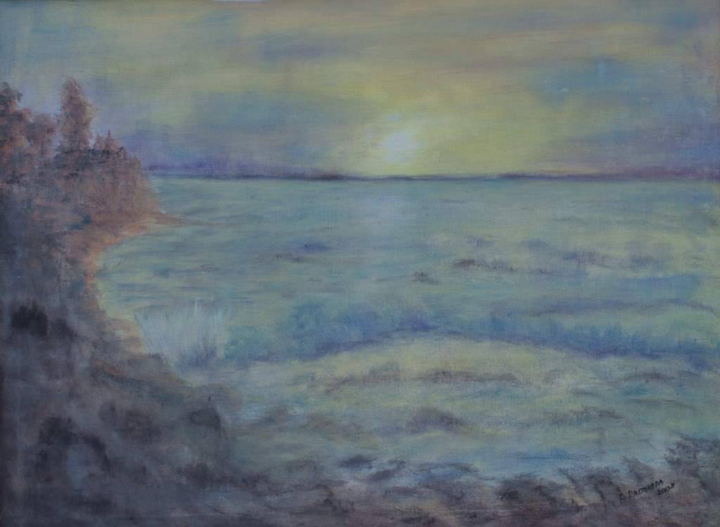 Na obrazie widzimy spokojny pejzaż nadmorski. Kolory są stonowane, dominuje błękit i zieleń morza oraz delikatny żółty odcień nieba. Na horyzoncie rozciąga się jasne światło zachodzącego słońca. Po lewej stronie widoczne są zarysy drzew i roślinności, tworzące delikatny kontrast z otwartą przestrzenią wody. Kompozycja obrazu jest harmonijna, a linia horyzontu dzieli scenę na pół, dając wrażenie spokoju i równowagi. Nastrój dzieła jest melancholijny, jakby przyroda zatrzymała się na moment, by odpocząć. Jest coś prawie magicznego w tej ciszy i spokoju, jakby wszyscy wyszli na moment na herbatę i zostawili świat sam sobie. Taka chwila zatrzymania. Artysta zastosował miękkie pociągnięcia pędzla, co nadaje obrazowi delikatność i eteryczny charakter. Technika impresjonistyczna wprowadza atmosferę ulotności chwili, jakbyśmy patrzyli przez lekką mgłę. Obraz może budzić uczucia tęsknoty czy refleksji nad przemijaniem czasu. Możemy też odczuć pewnego rodzaju nostalgię za spokojnymi, bezstroskimi dniami spędzonymi nad wodą. Można się tak zapatrzeć i zgubić w marzeniach, prawda? Jeden element sunlight dodaje całości ciepła i tajemnicy, przyciągając wzrok. Może komuś przypominać letnie wieczory, kiedy wszystko wydaje się możliwe. "To jak być na wakacjach" — powiedziałoby siedmioletnie dziecko, patrząc na ten krajobraz. Obraz ten może nas skłonić do zastanowienia się nad pięknem natury i chwilami, które często umykają w codziennym zgiełku.