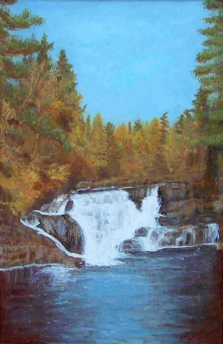 Pośród zarośli i drzew wodospad nieduży spada i pieni się na strumyku górskim o jesiennej złocistej porze.