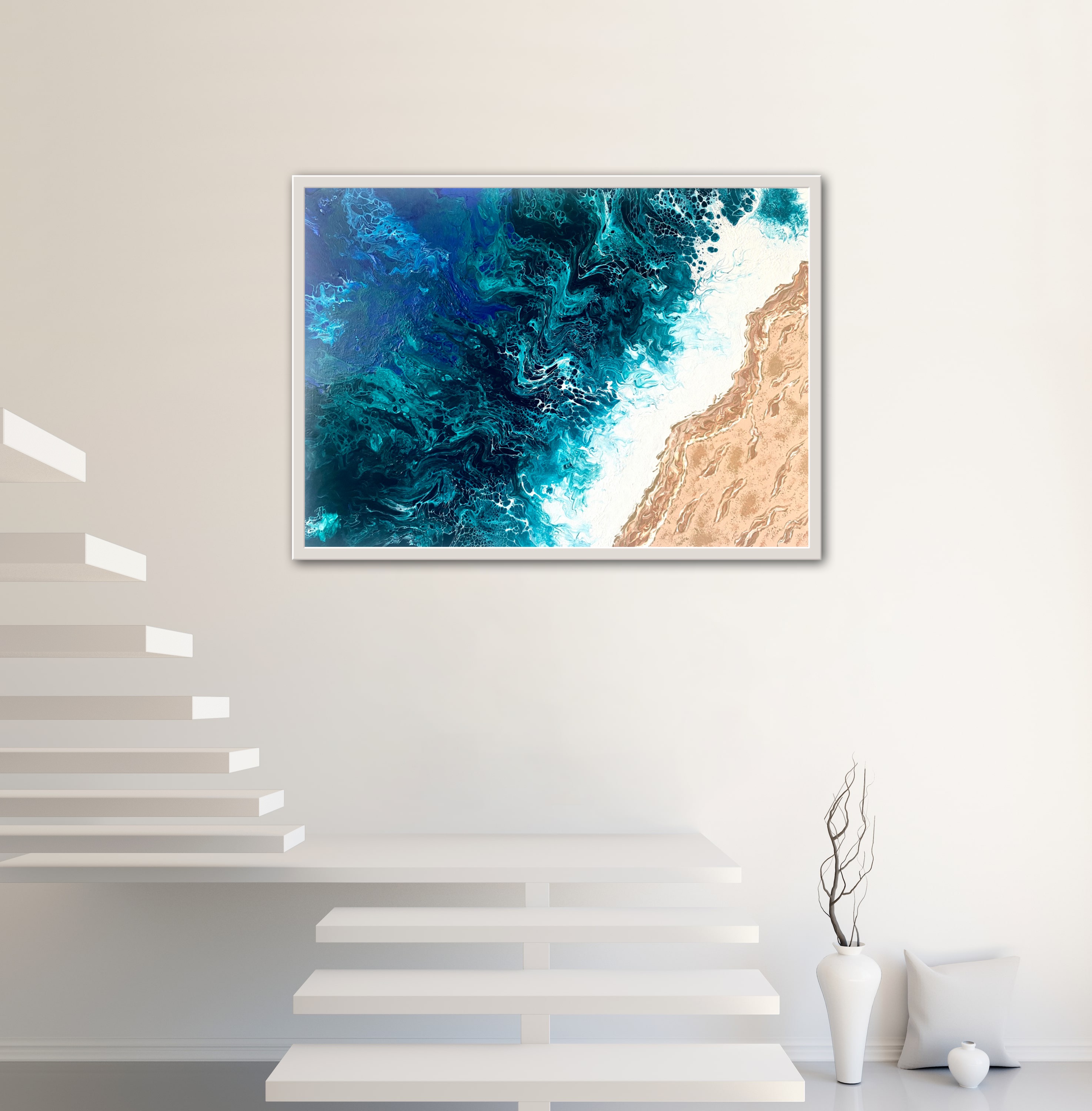 Obraz abstrakcyjny przedstawiający dzikie wybrzeże Indyjskie. Kolor dominujący to morski zielony i złoty. Obraz zainspirowany jest podróżą artysty do Tanzanii we Wschodniej Afryce. Praca posiada soczyste i energetyczne kolory, dzięki czemu wniesie dobrą energię do każdej przestrzeni. Obraz idealnie pasuje do salonu, gabinetu oraz do przestrzeni biurowej. Obraz to także świetny prezent dla miłośników nowoczesnych wnętrz.